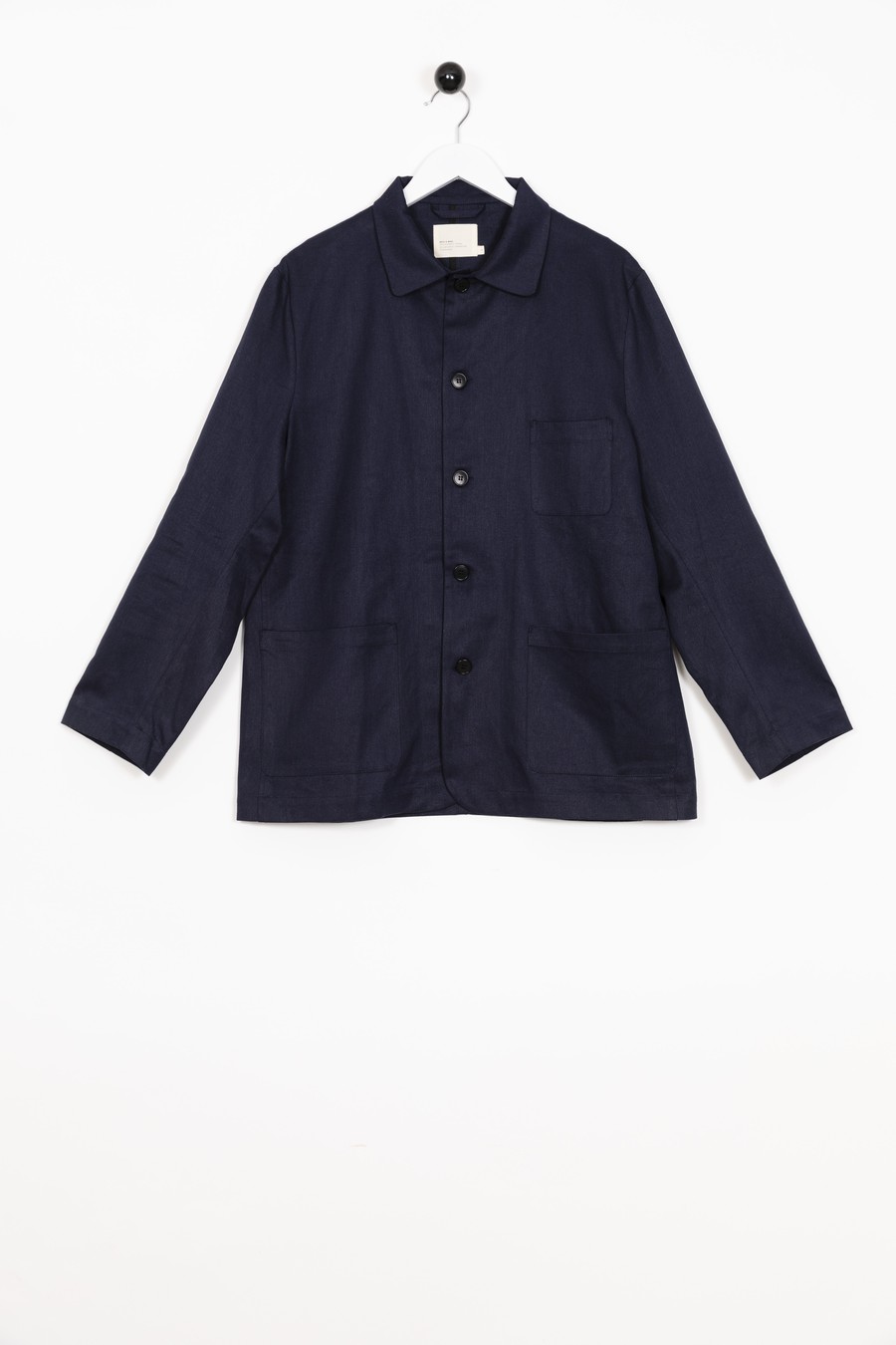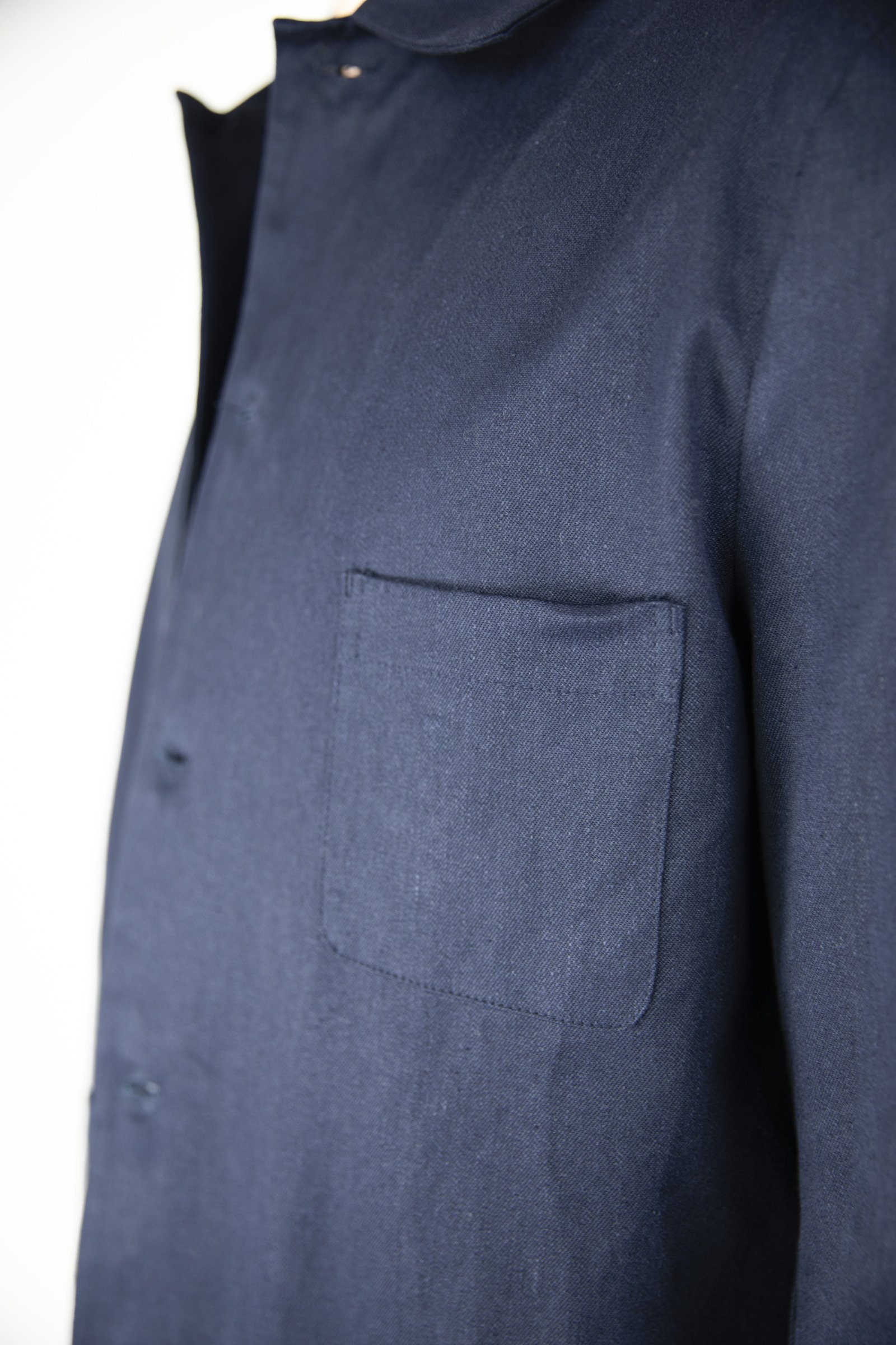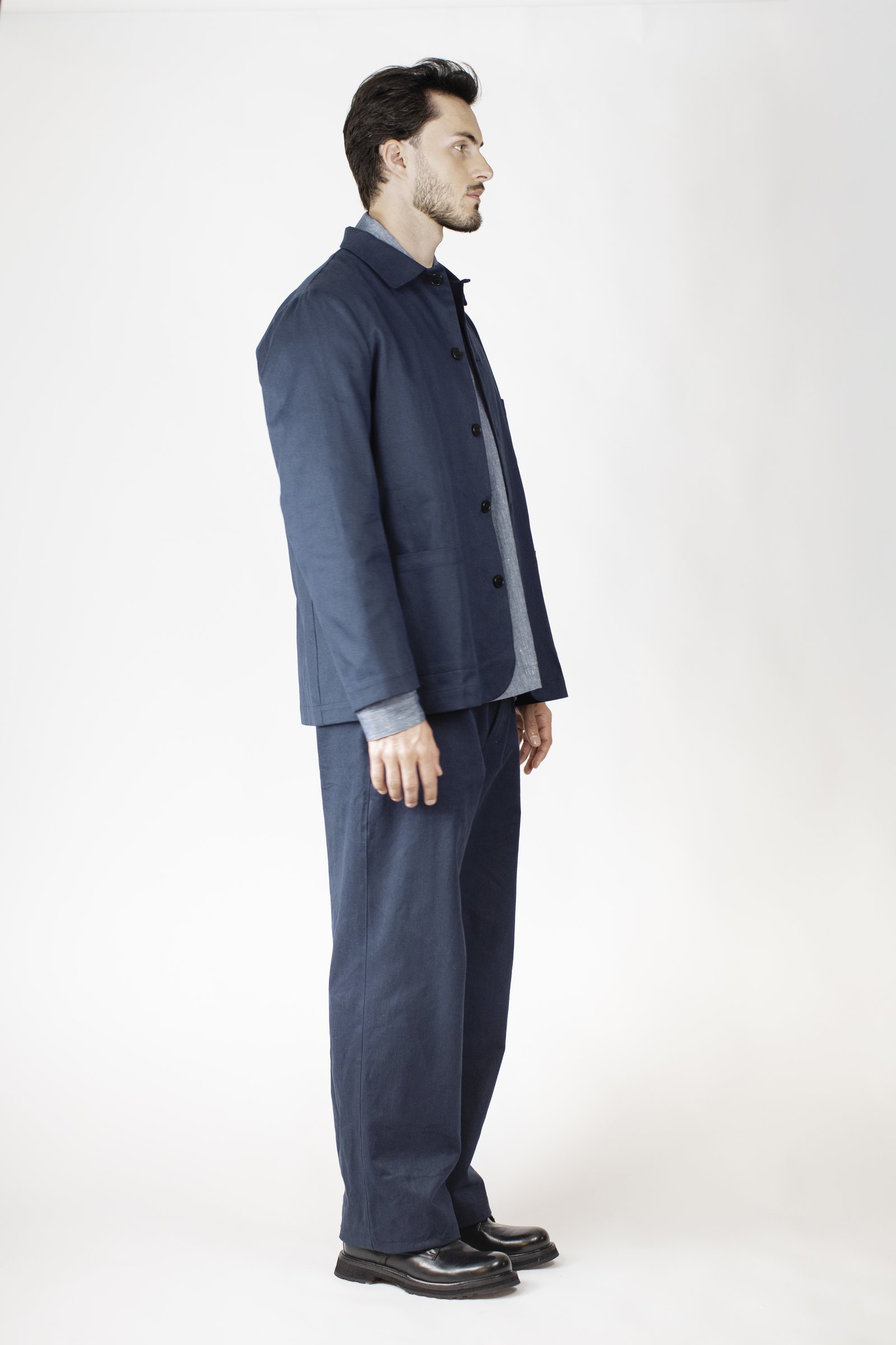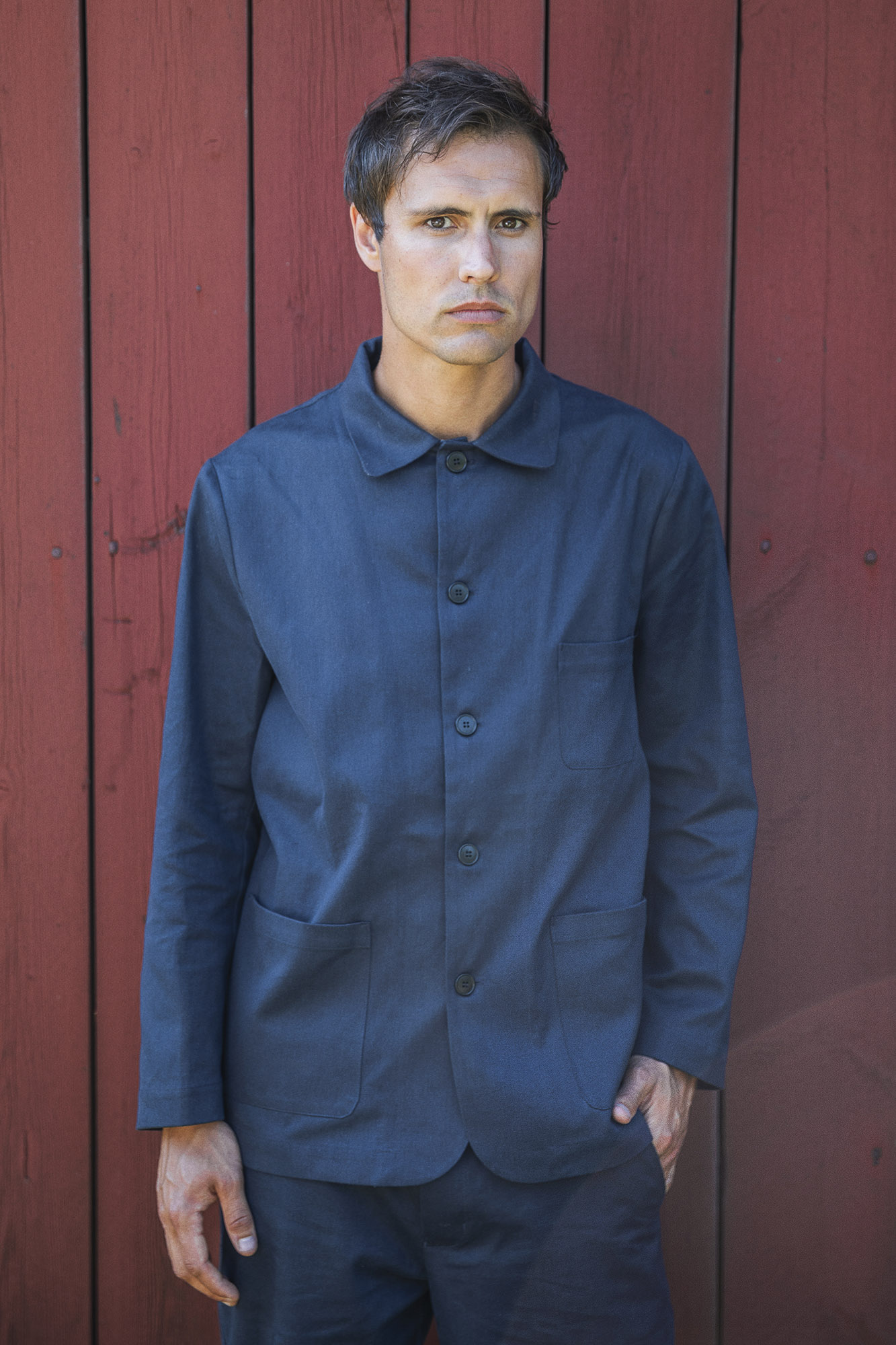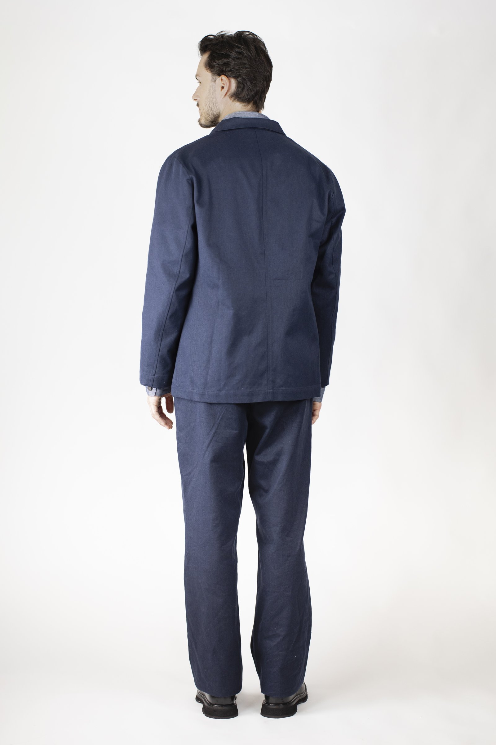 Unlined jacket with patched small breast pocket and two larger patched pockets.
