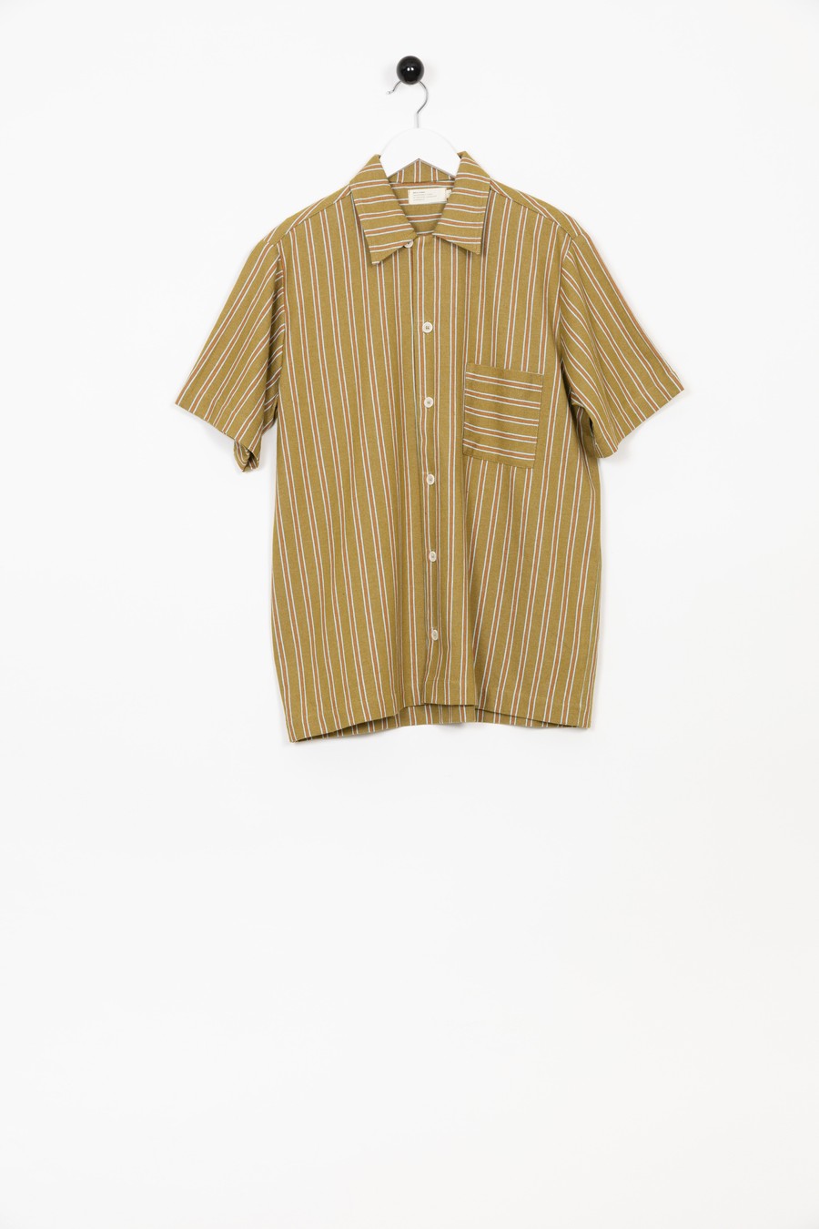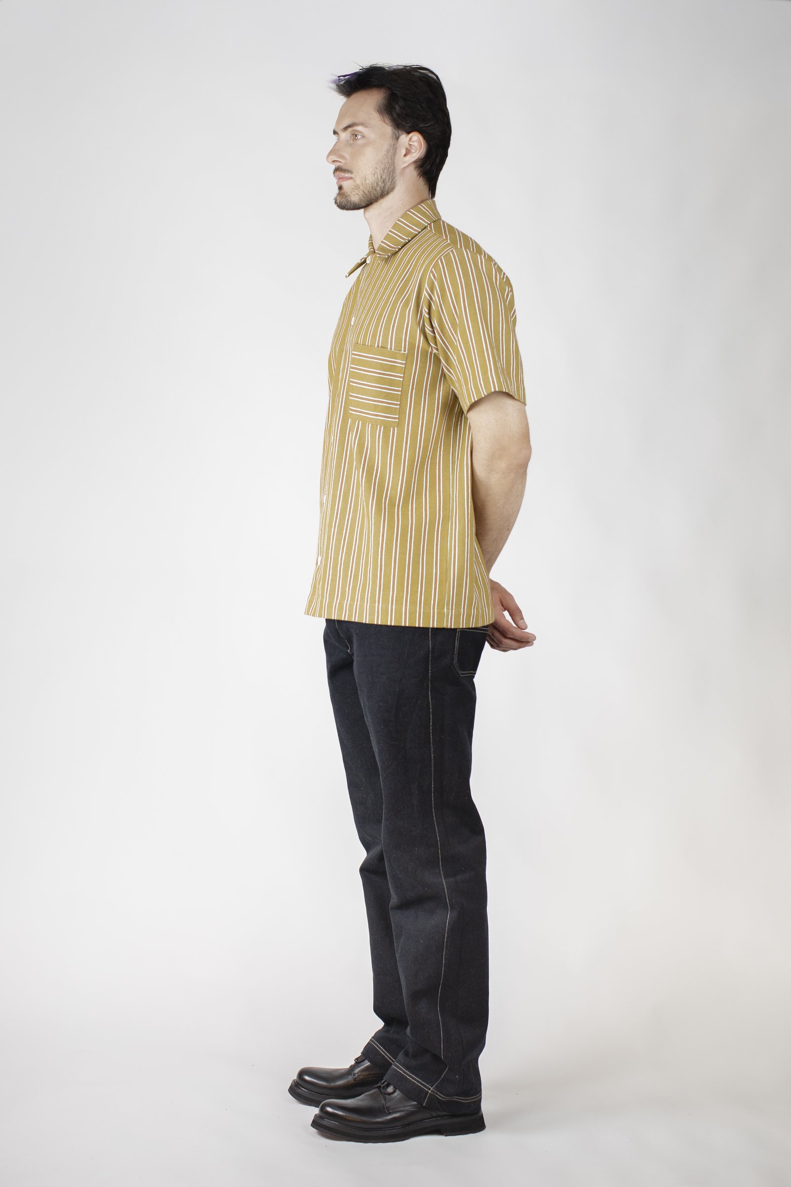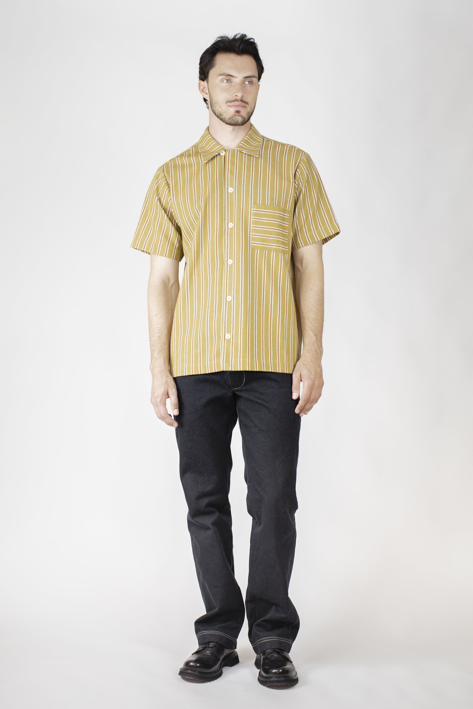 Short sleeved shirt with patched breast pocket with bias stripes.