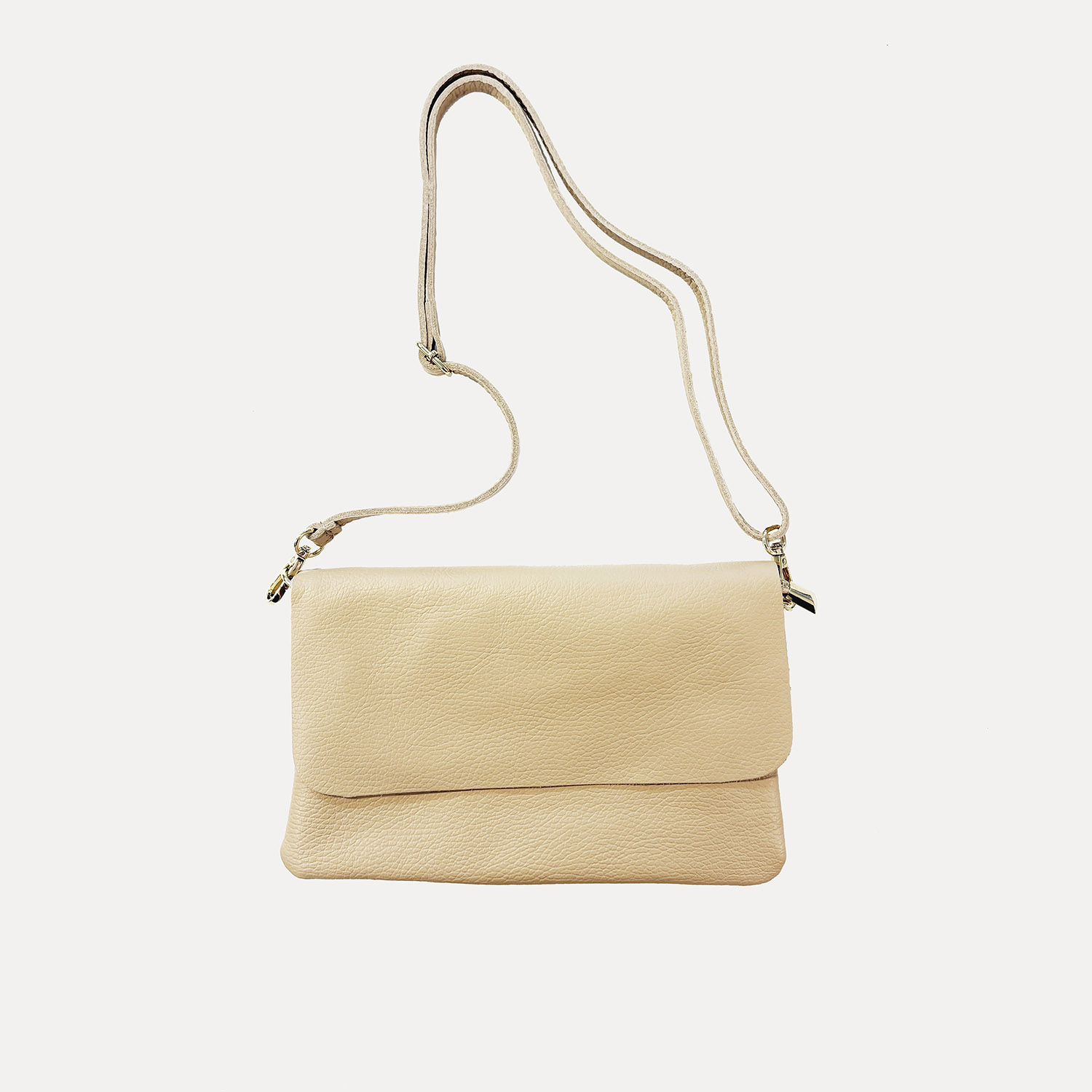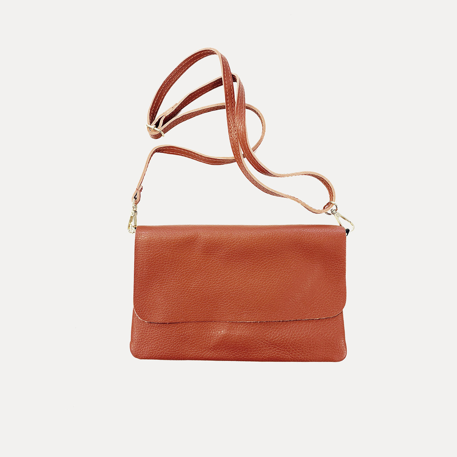 A leather crossbody bag with a removable shoulder strap. One zipped inside pocket. Details in gold colored metal. Brand: Marlon Material: 100% leather. Size: 25*15*1 cm. Care: Dry off with damp cloth. Made in: Italy.