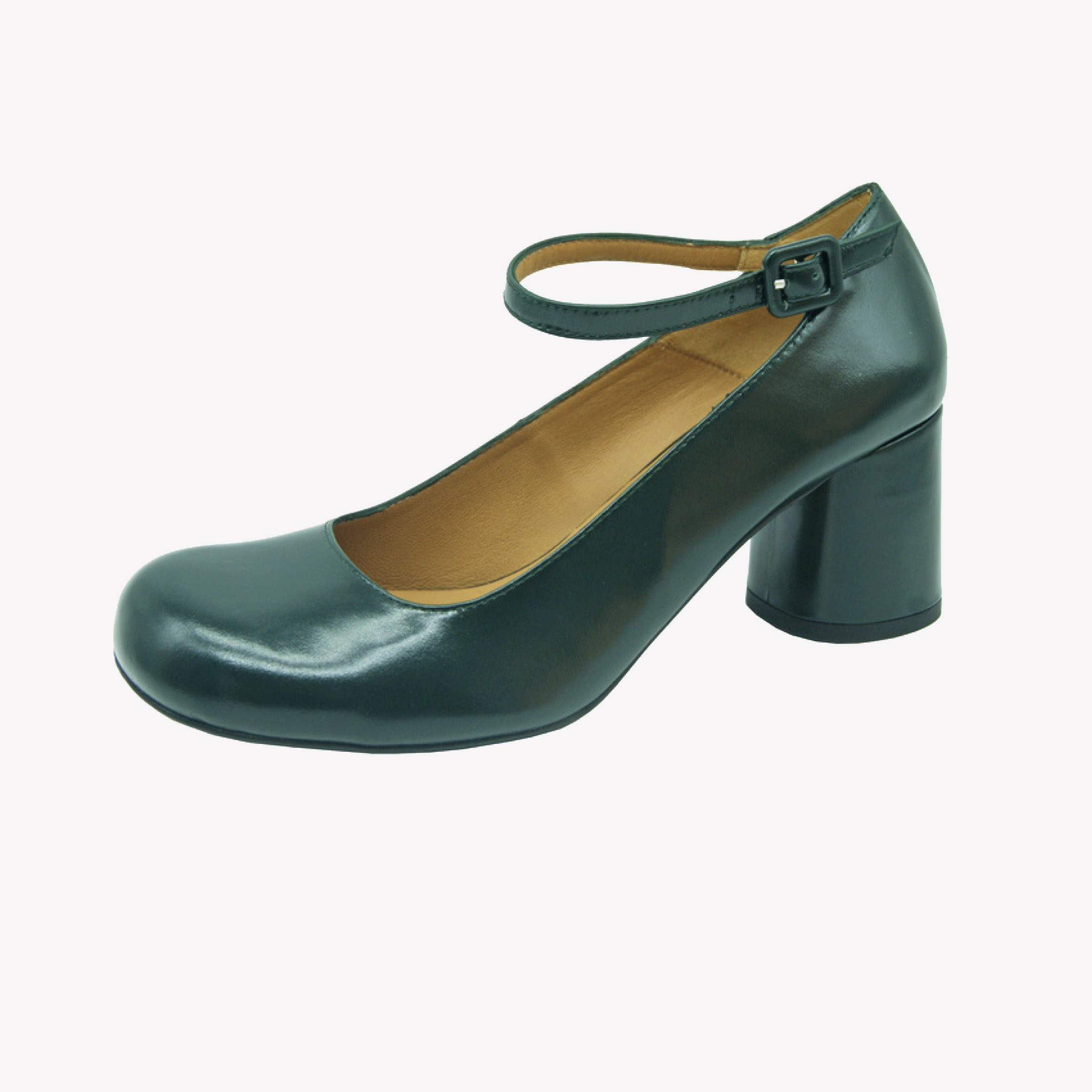 Mid heeled shoe in dark green leather with a rounded toe and fasten with ankle strap and buckle fastening.