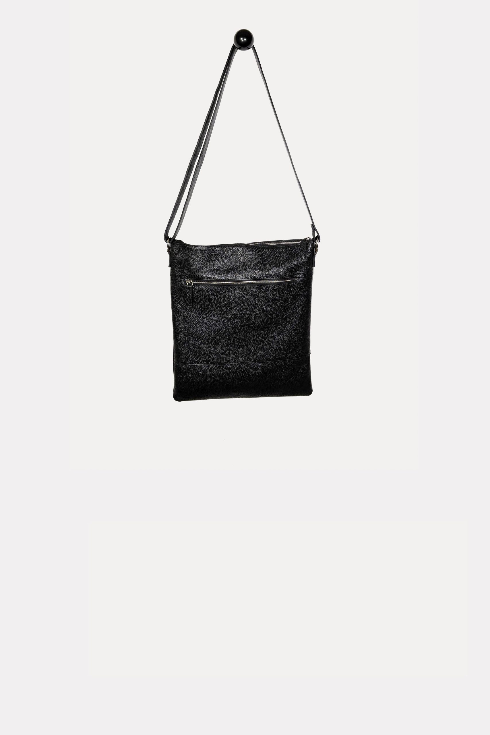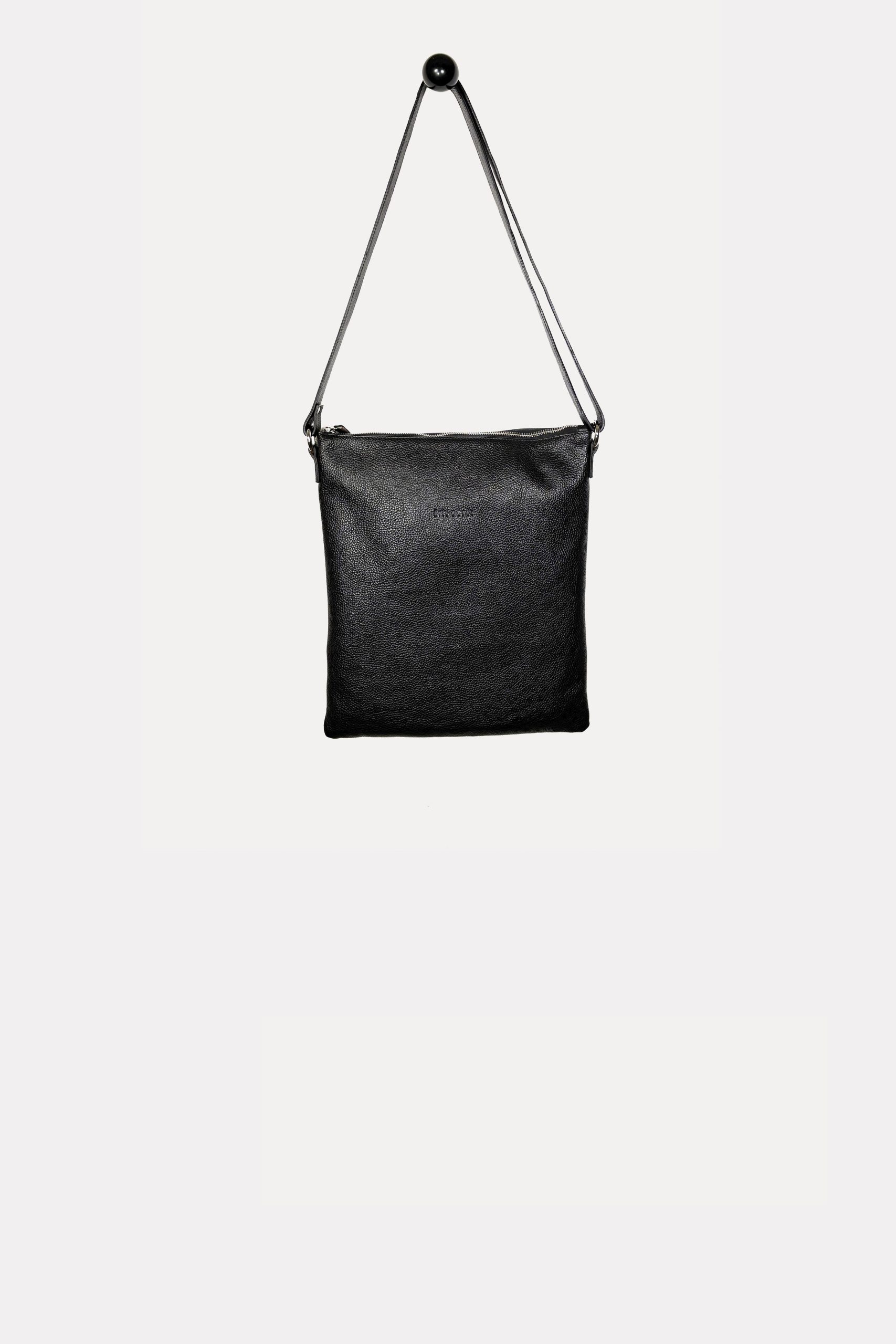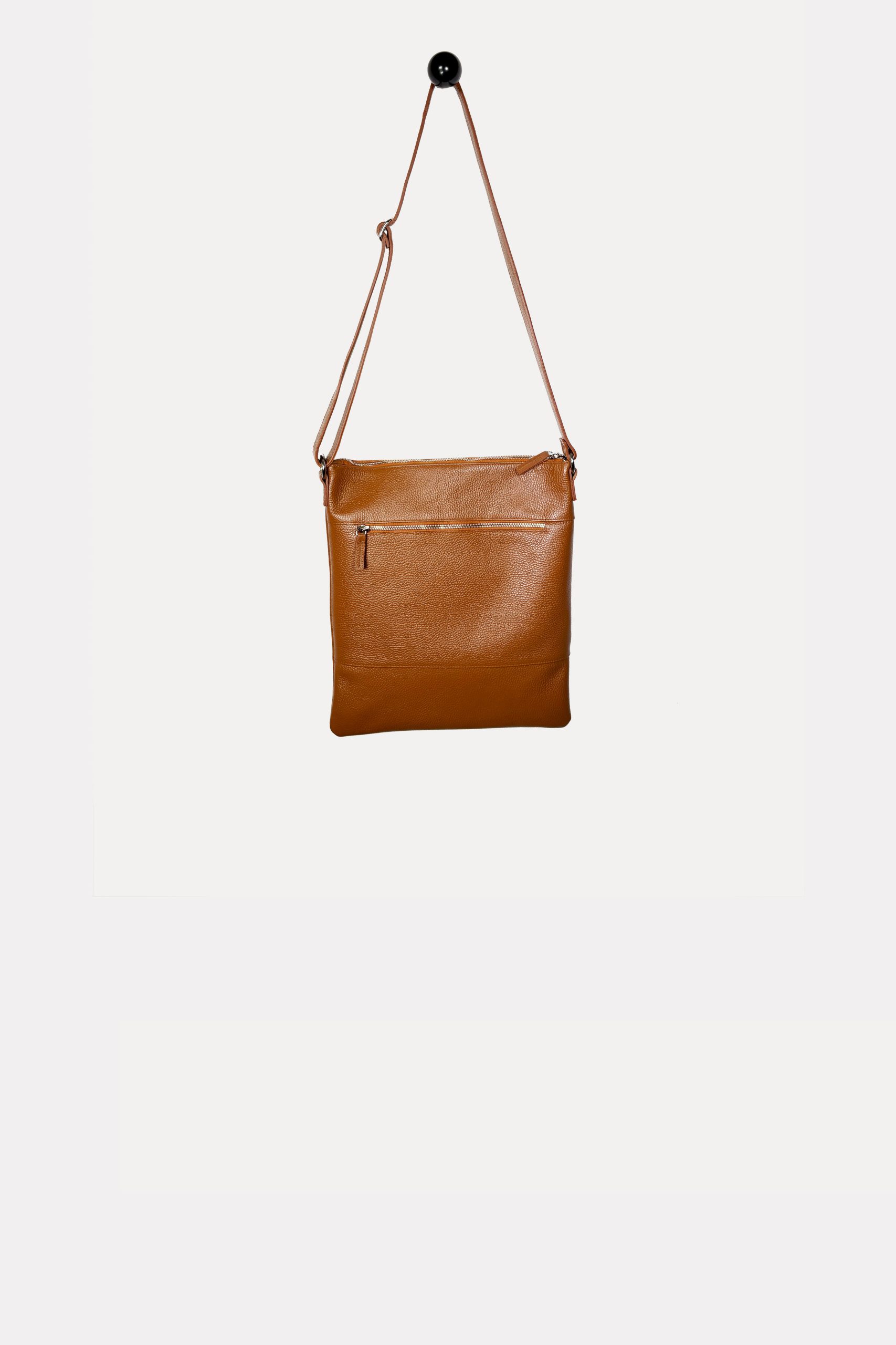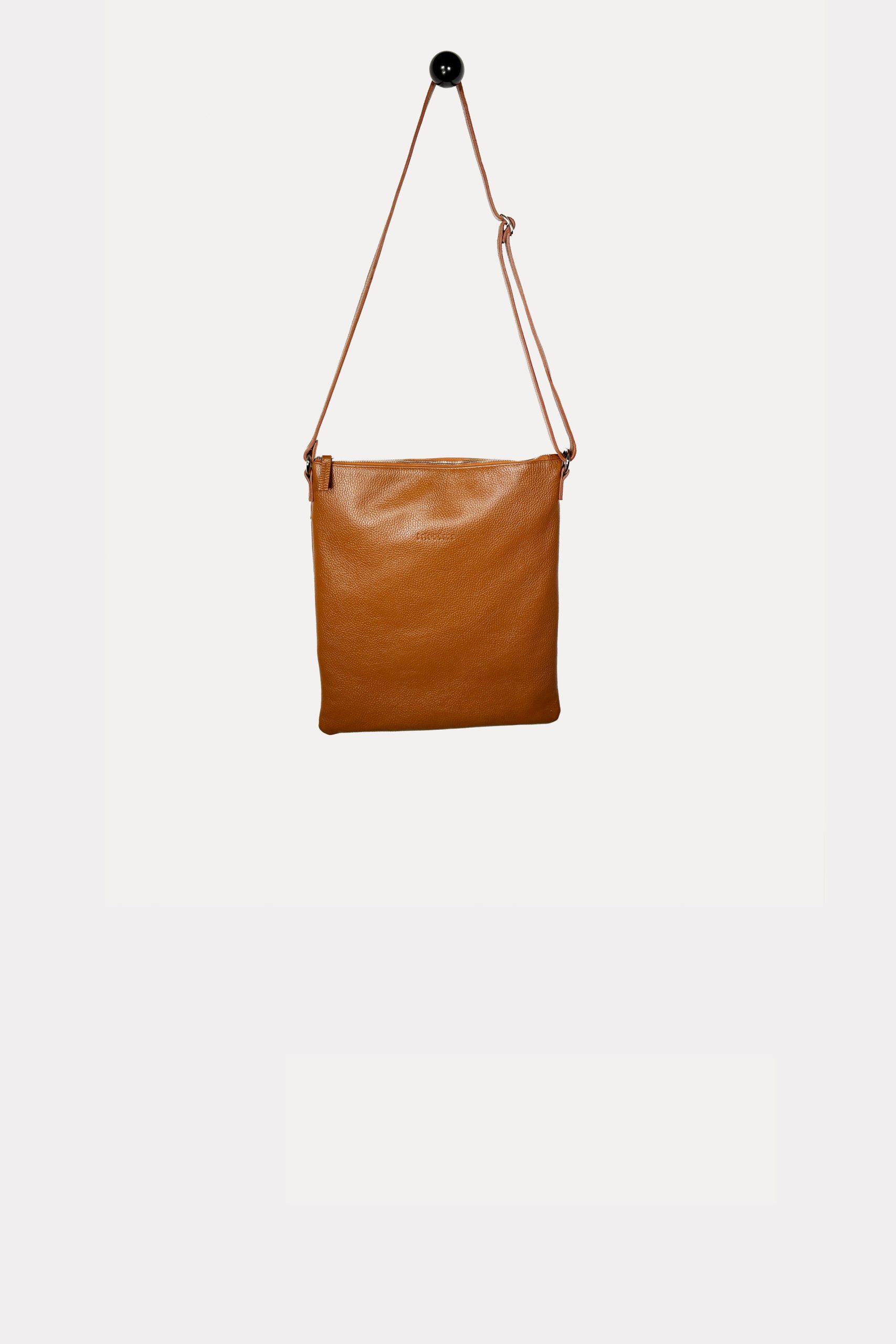Lined leather bag with an adjustable leather strap and zip closure..