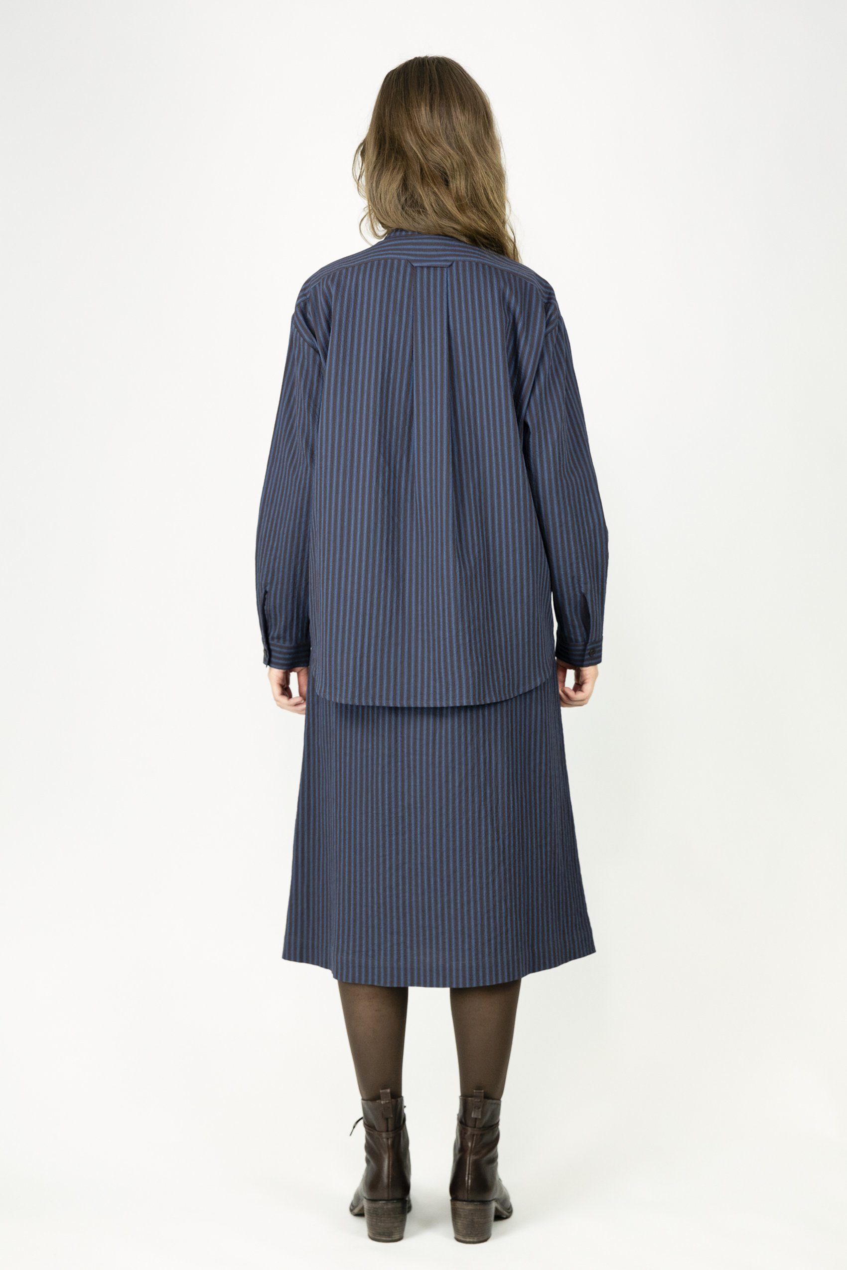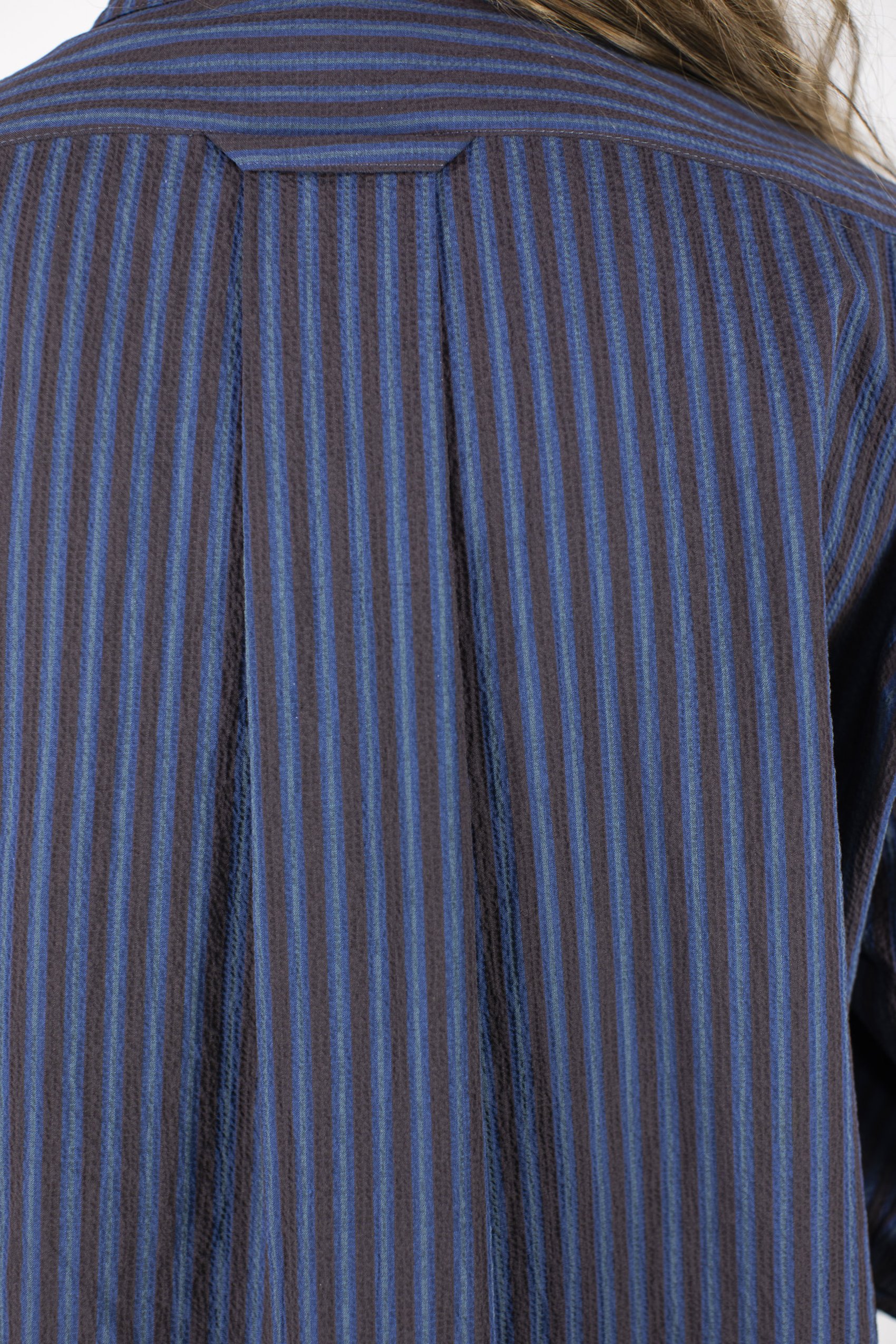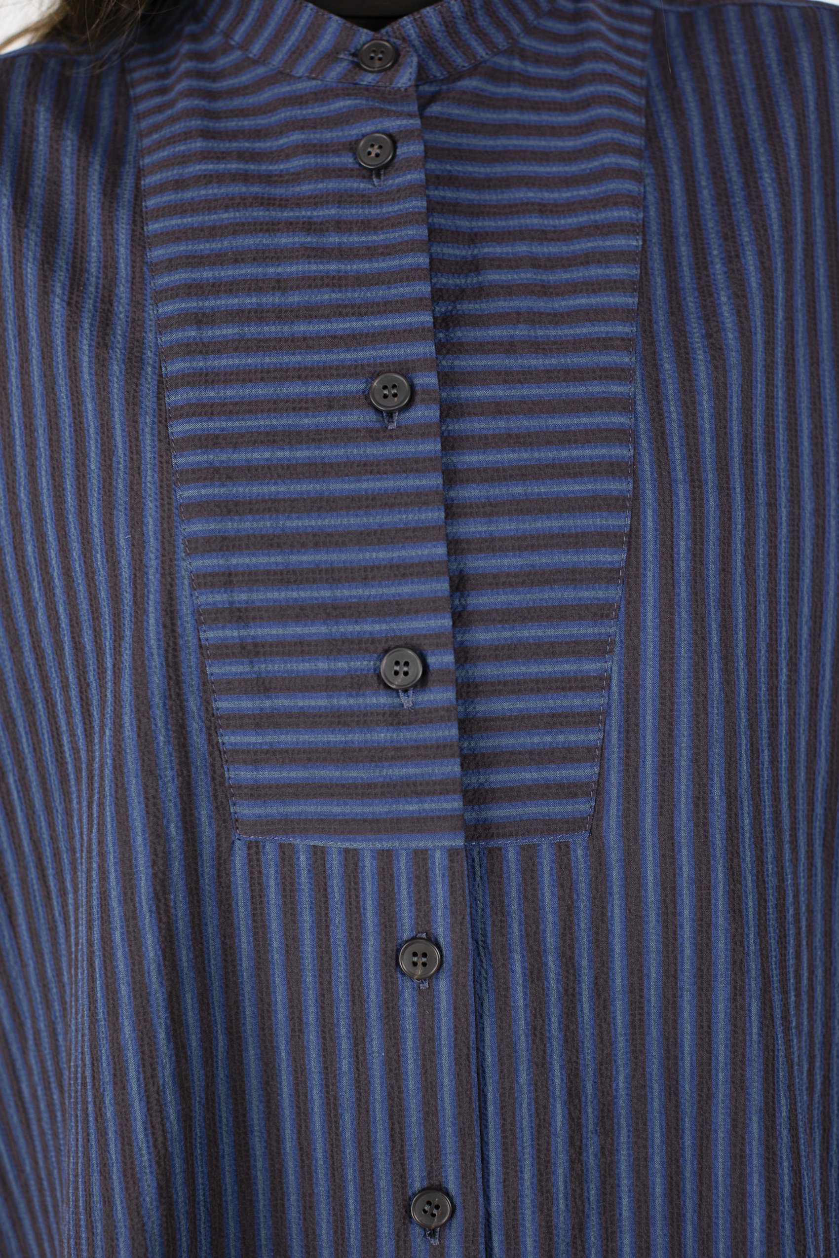 Fine seersucker shirt with stand collar. Yoke with crosswise stripes. Pleat in back. Mother-of-pearl buttons.