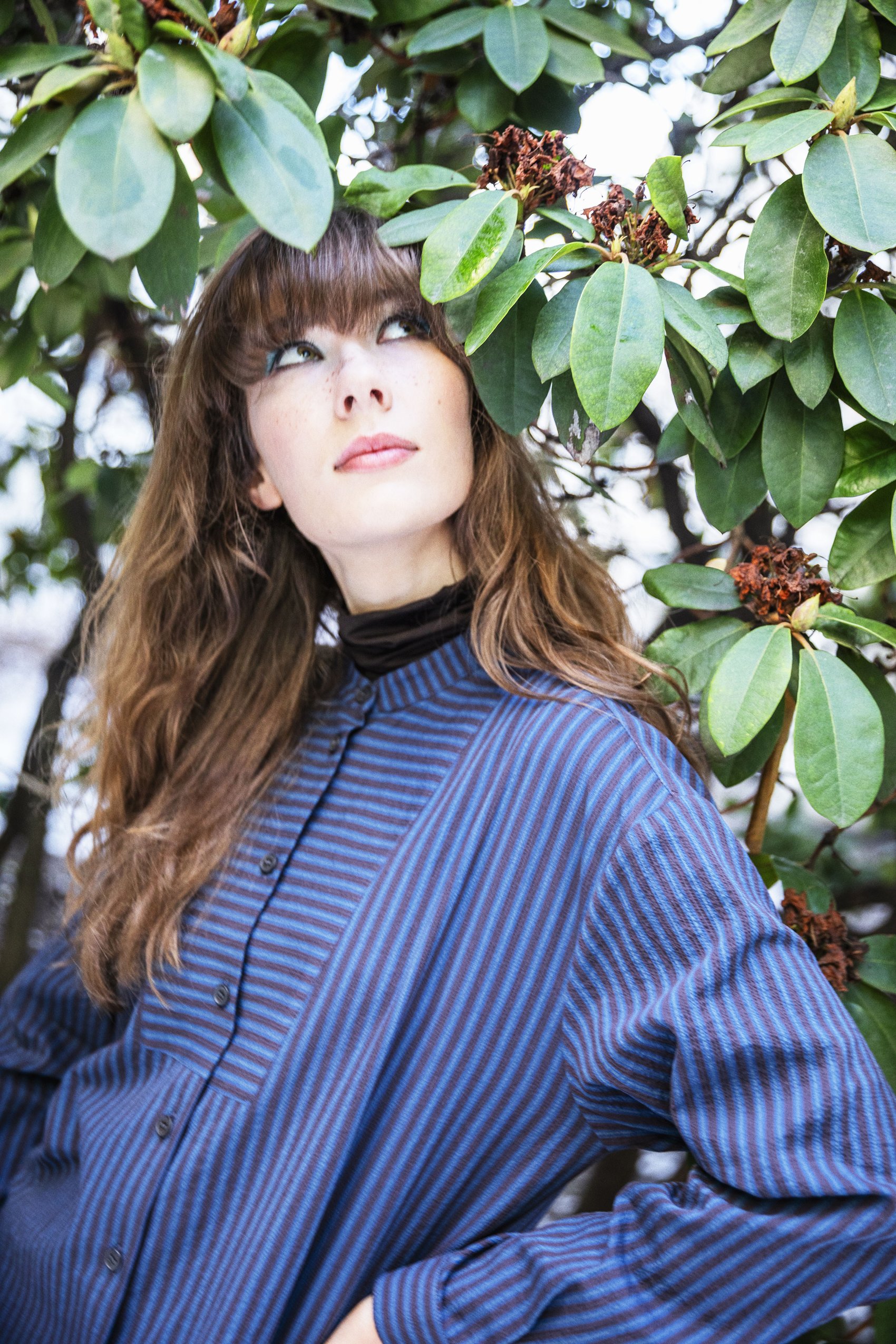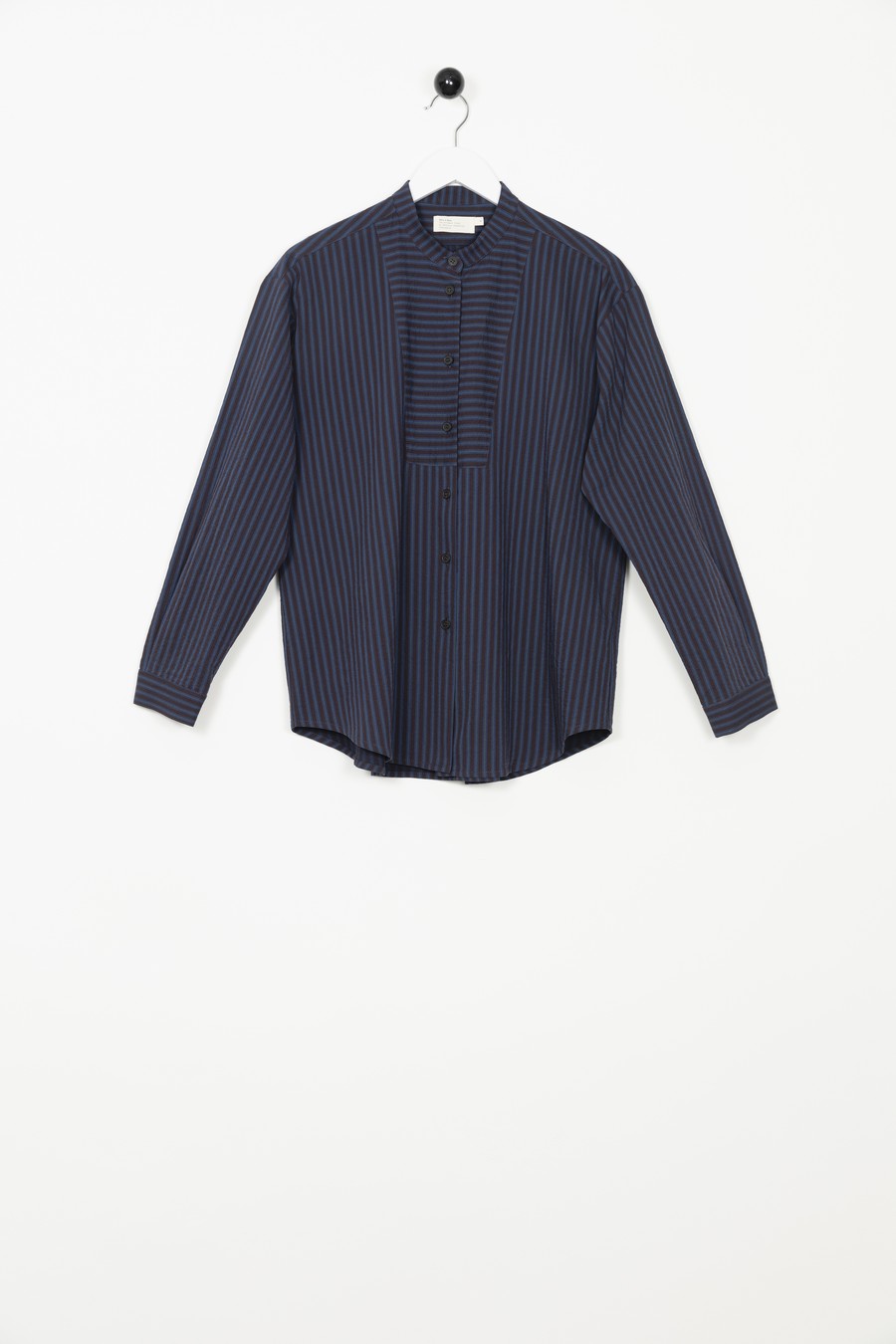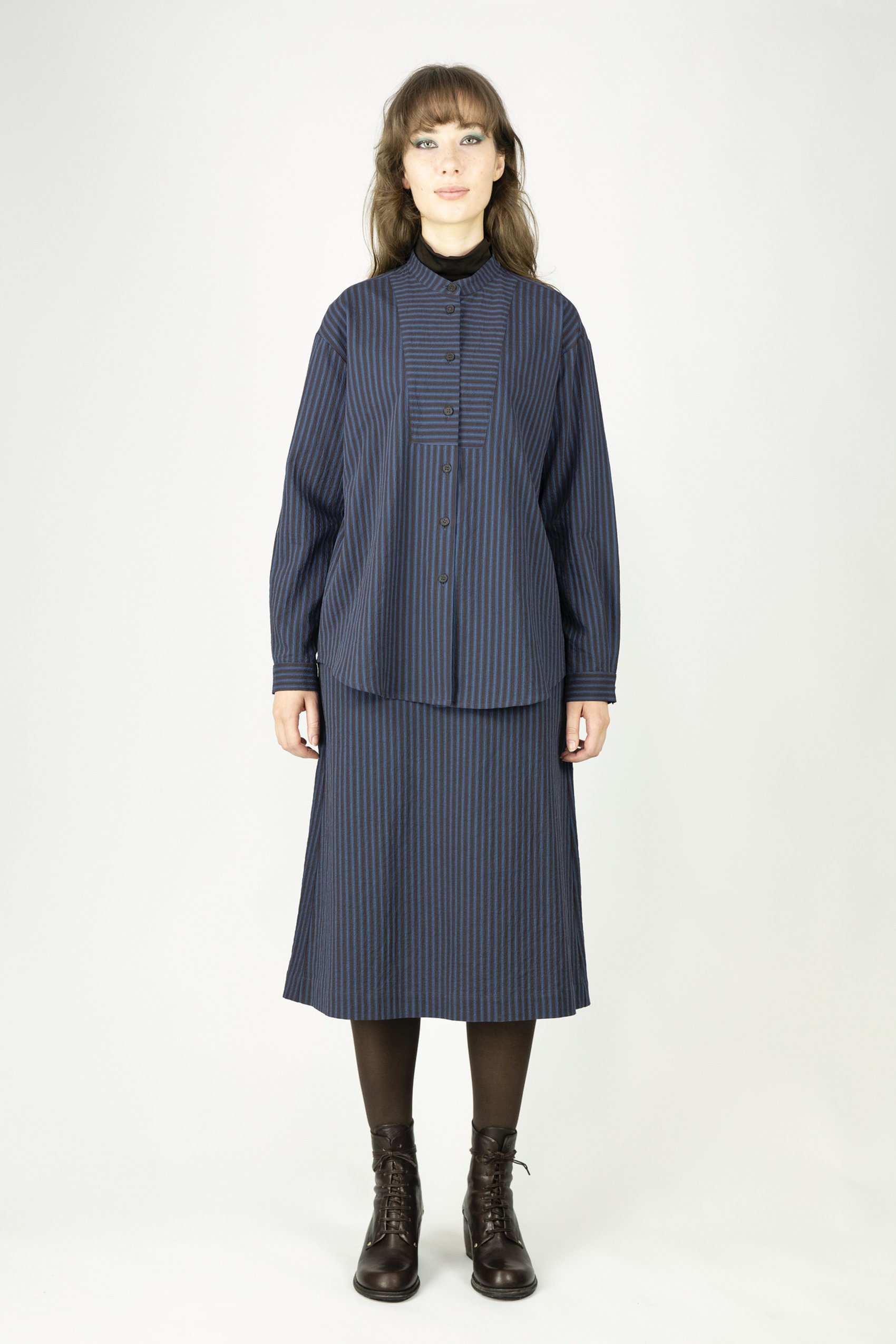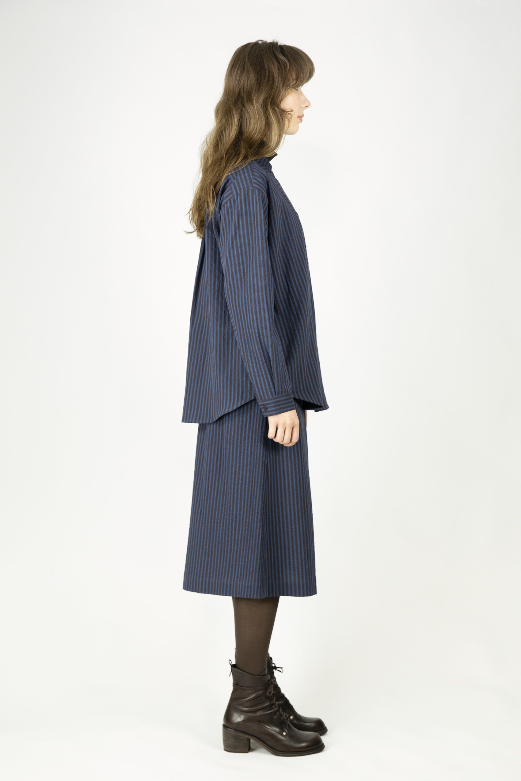Fine seersucker shirt with stand collar. Yoke with crosswise stripes. Pleat in back. Mother-of-pearl buttons.