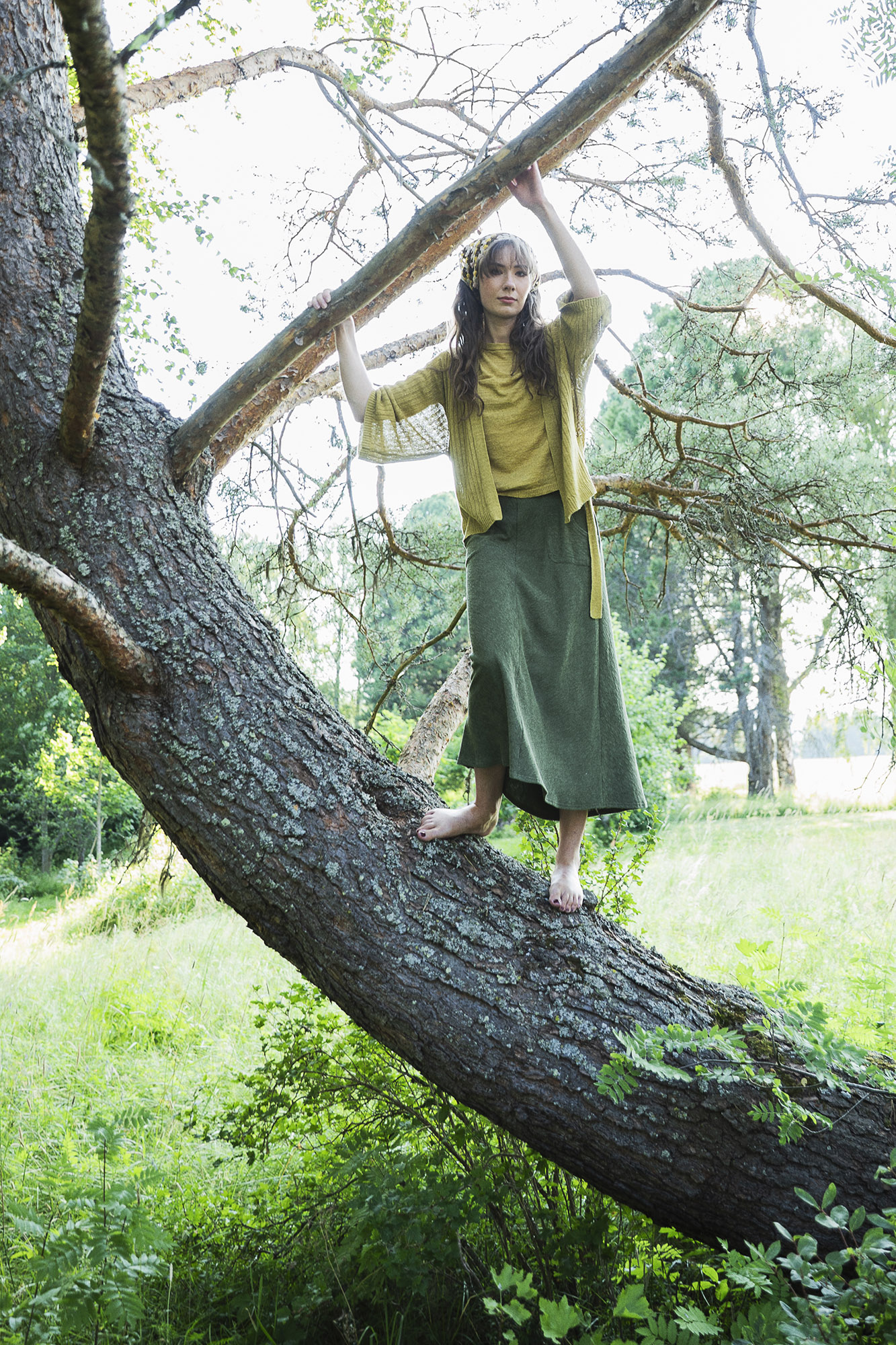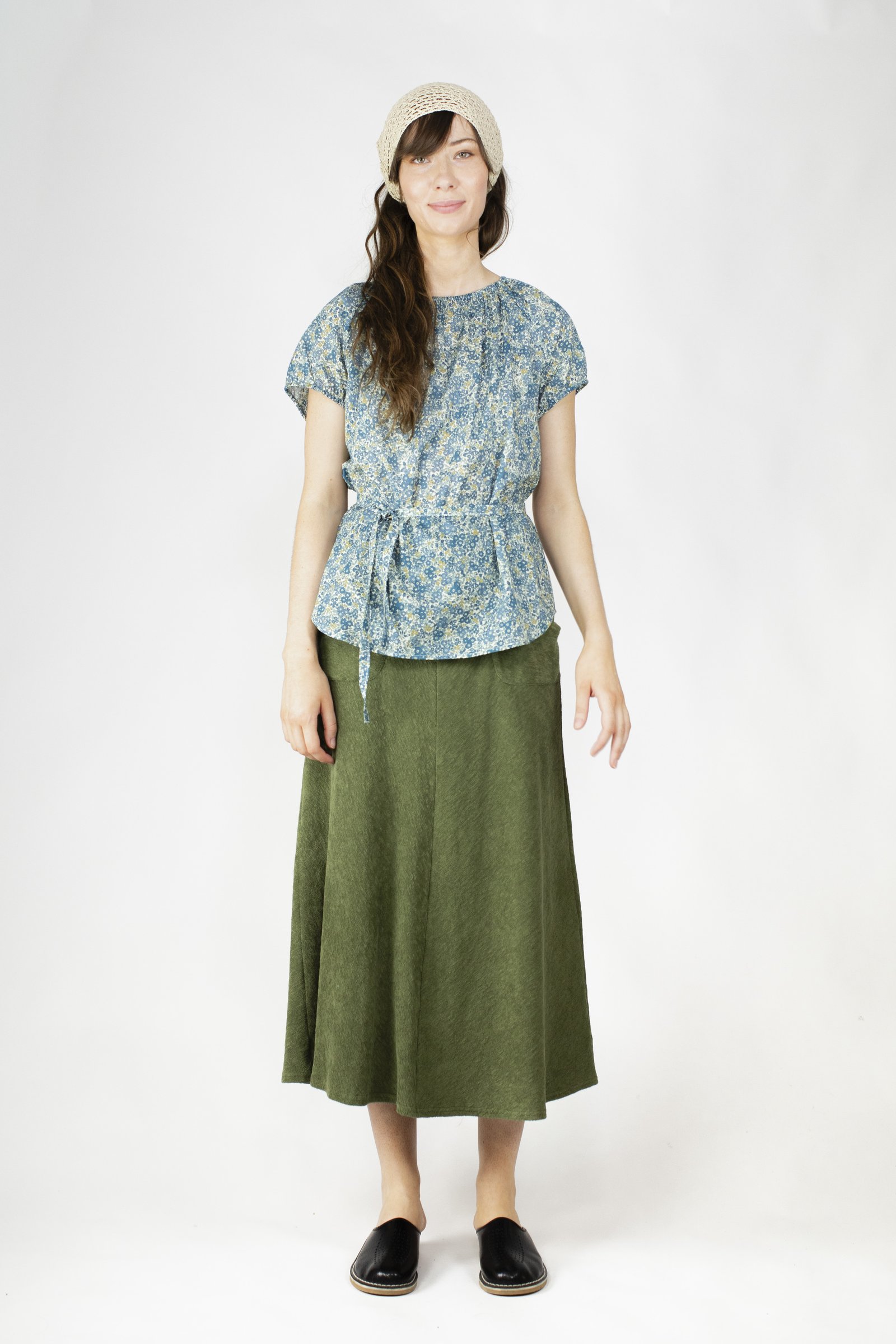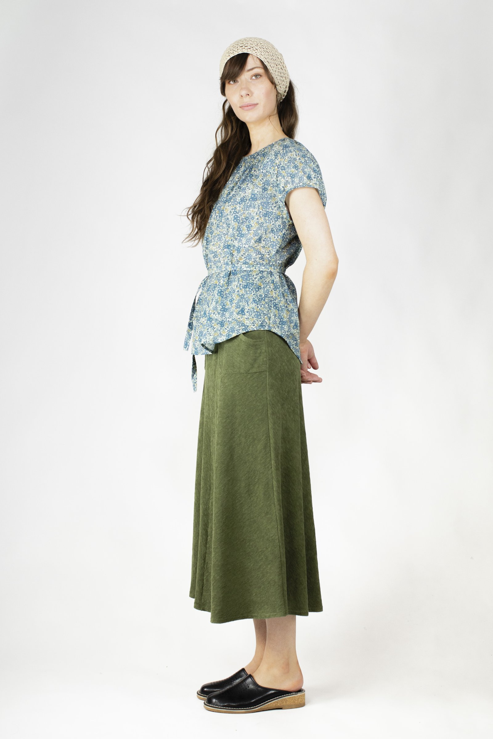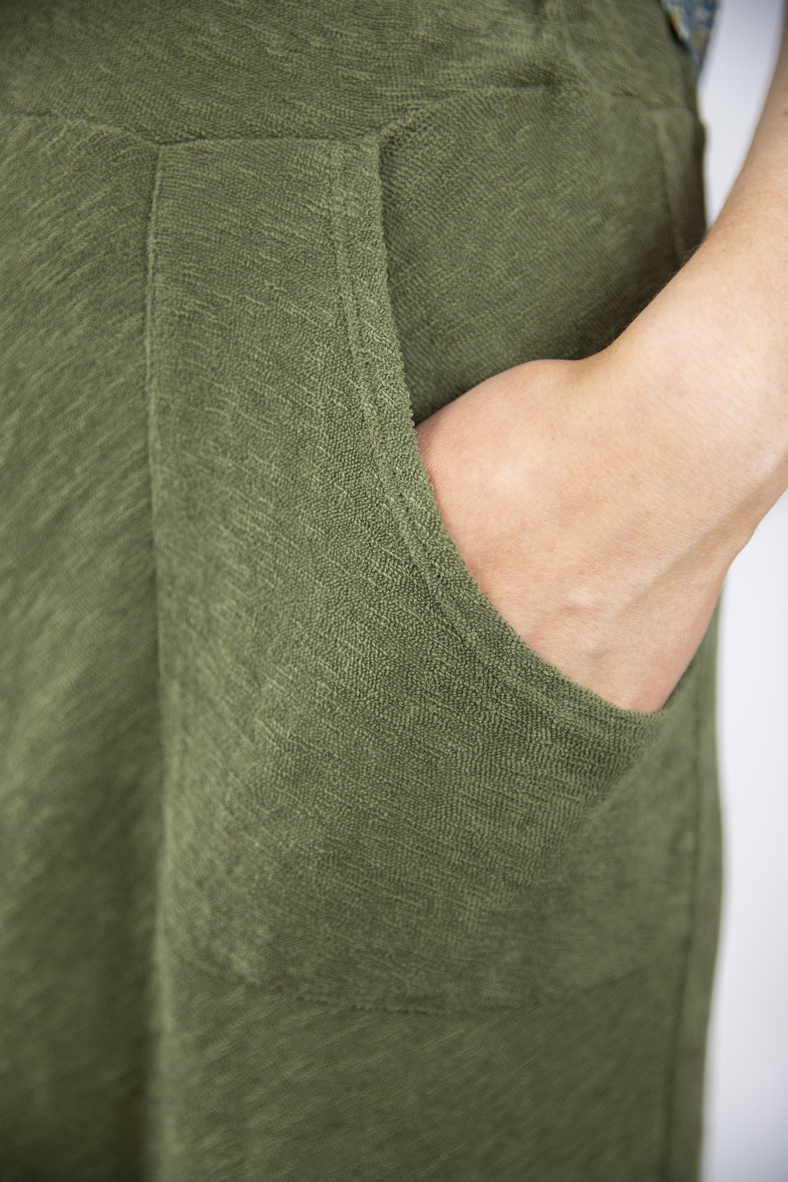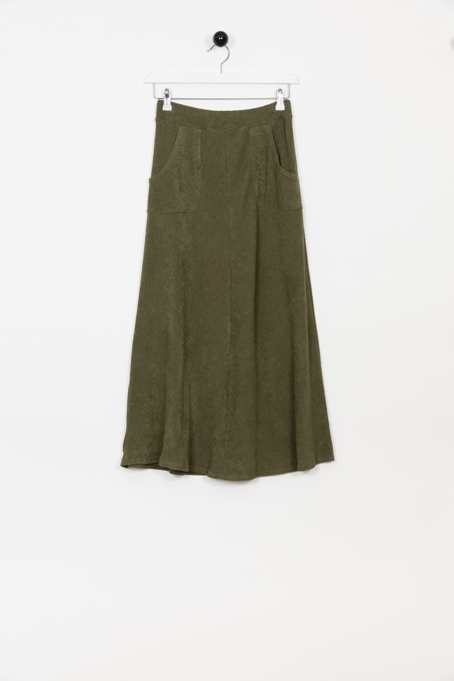 Terry cloth skirt with patched pockets in front. Elastic waistband.