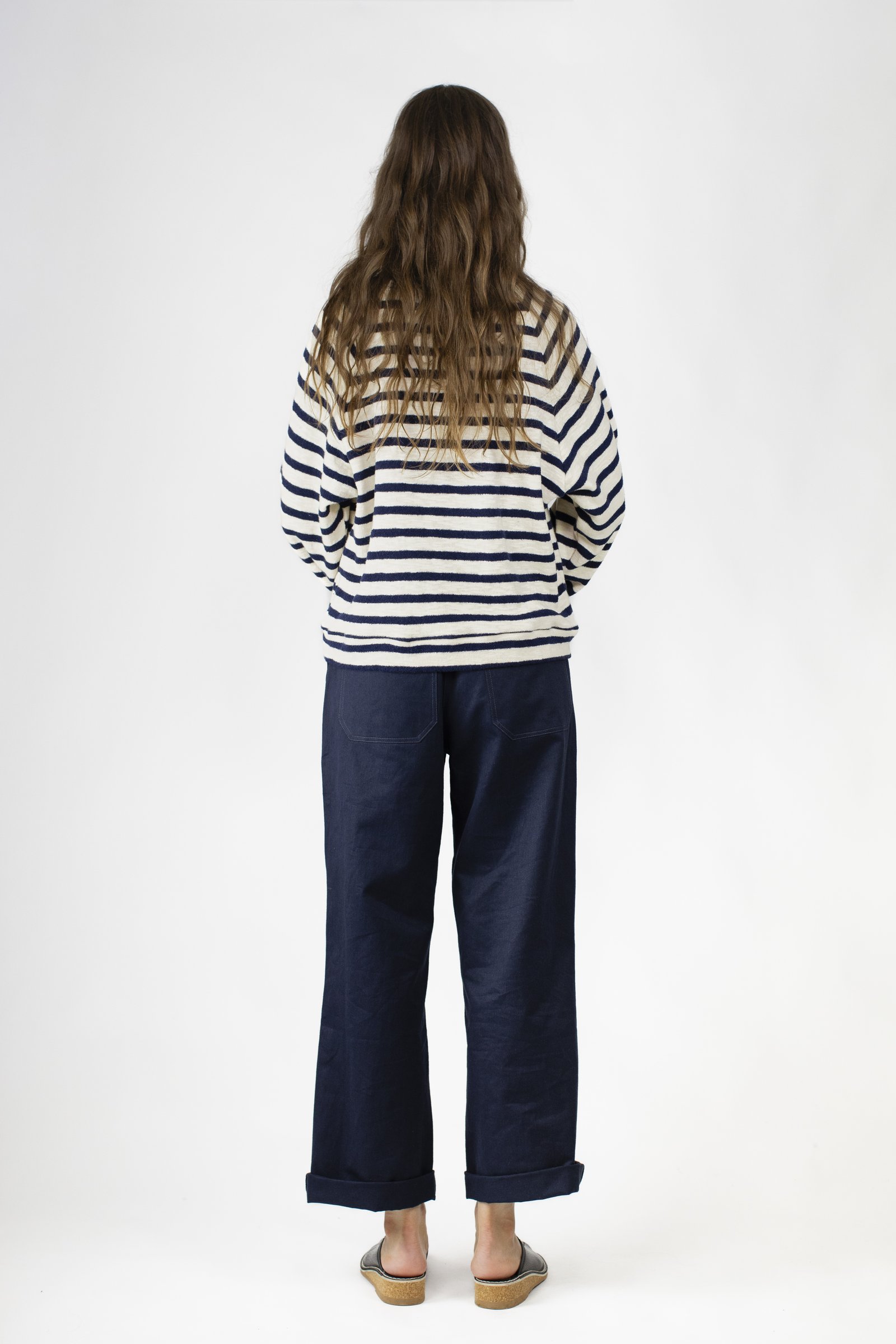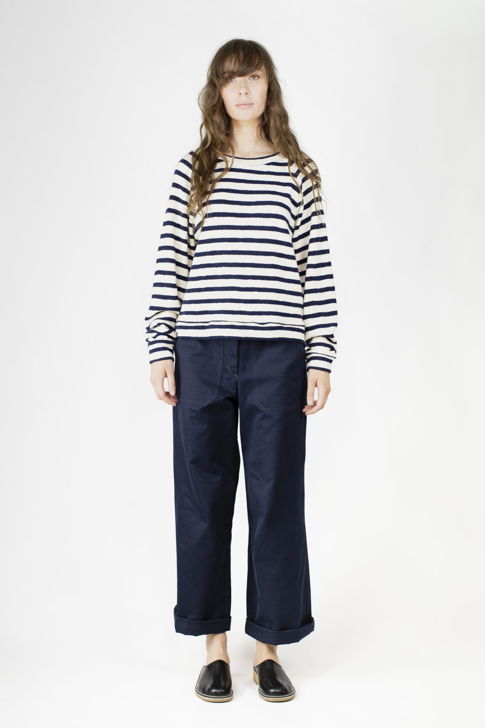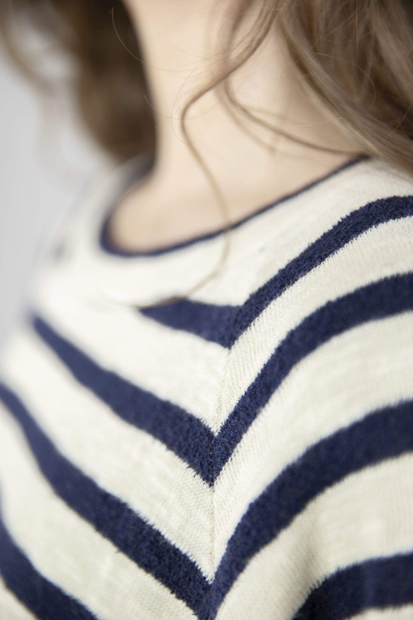 Double striped jersey sweater with raglan sleeves. Double cuffs in ends.