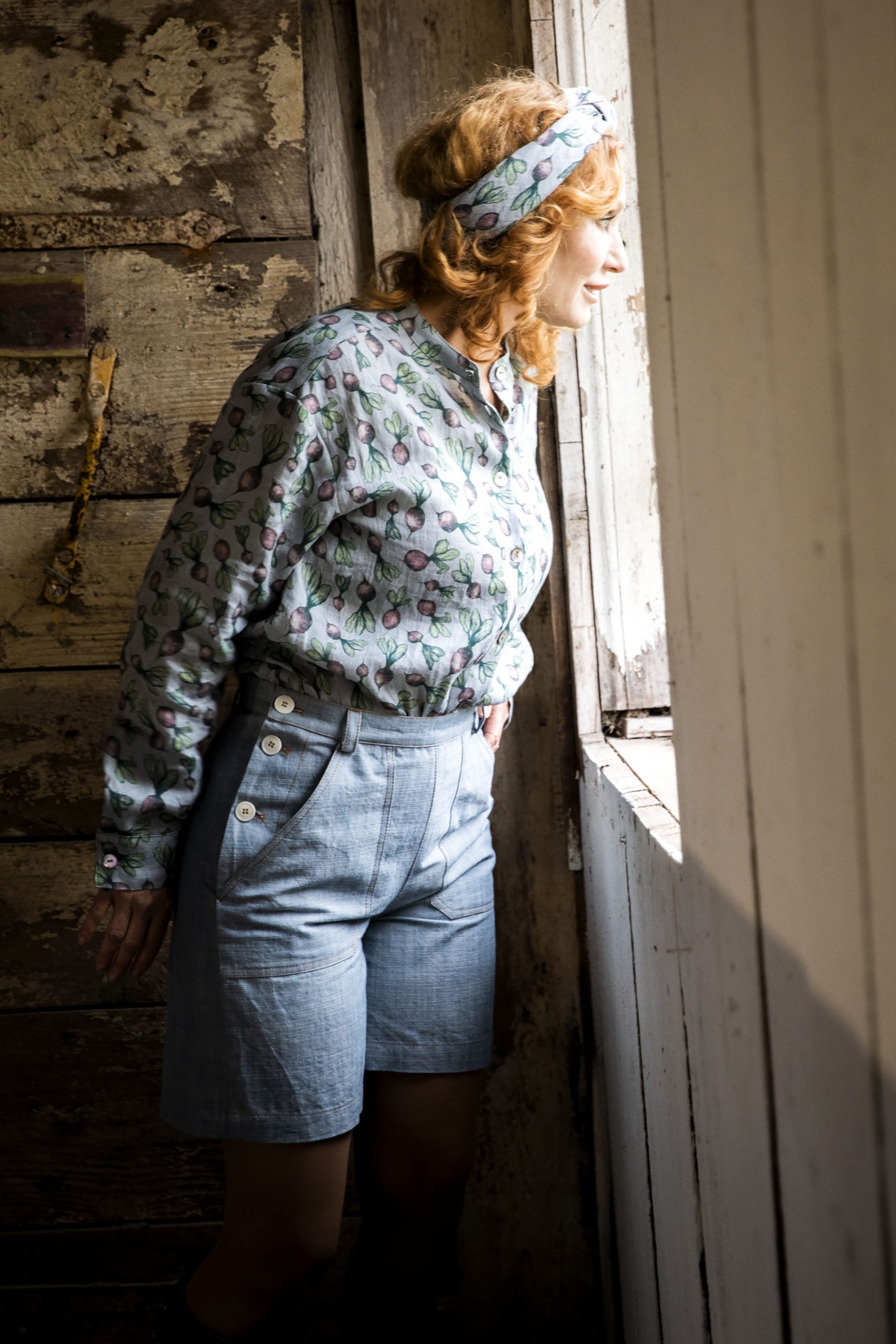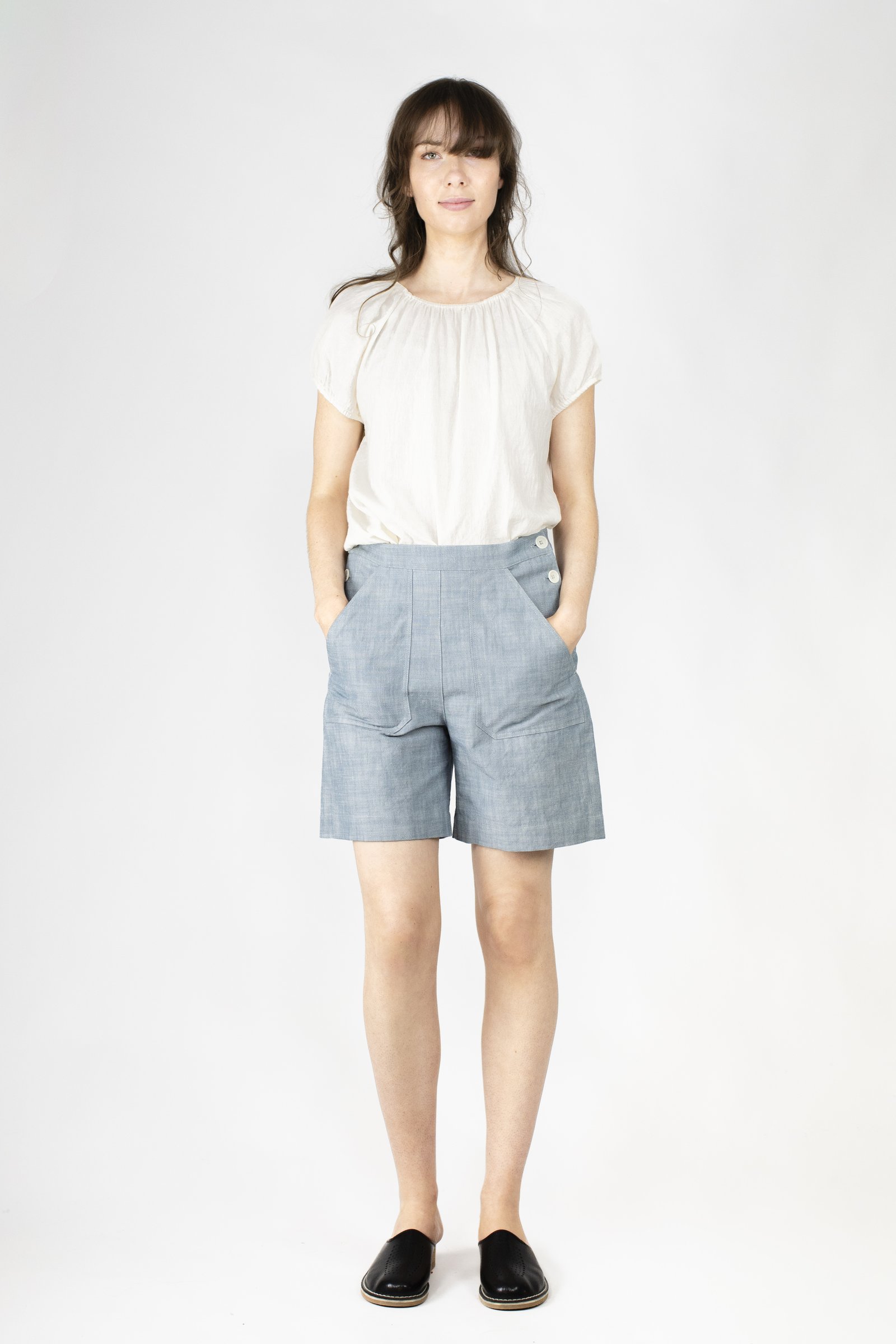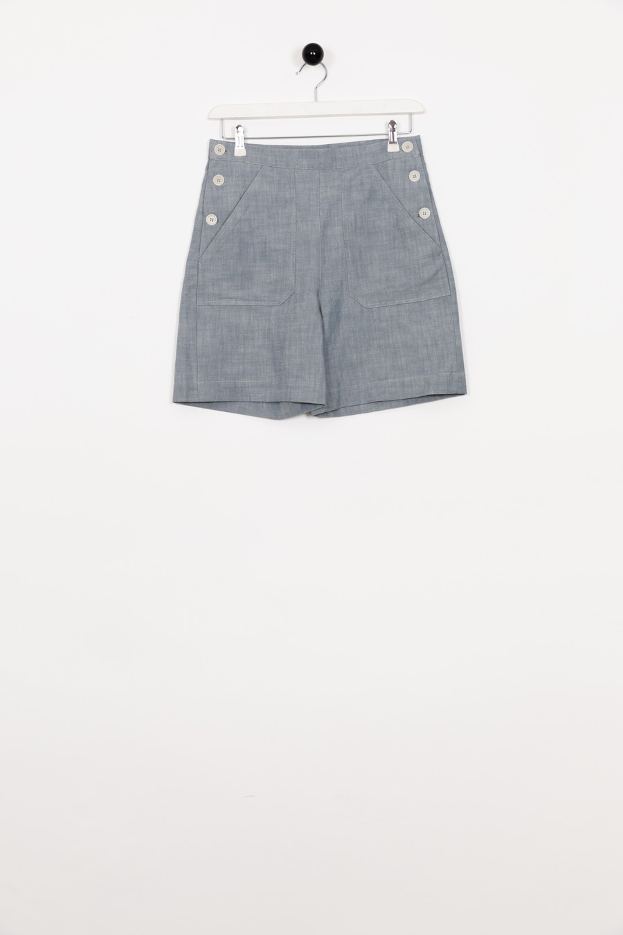 Shorts buttoned on both sides. Patched pockets in front. Corozo buttons.