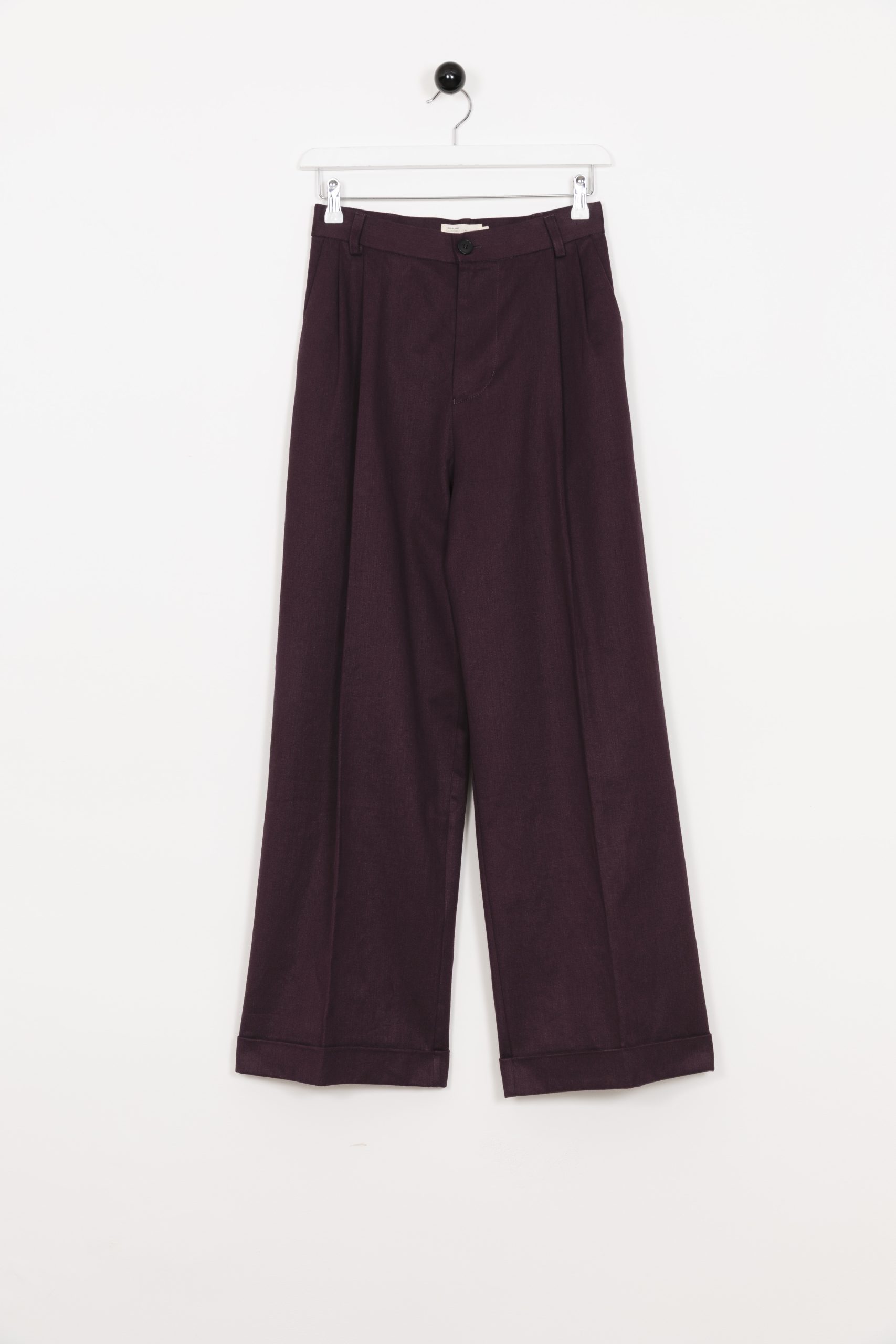 Wide trousers with front pleats. Slanted side pockets. Jetted pockets in back.