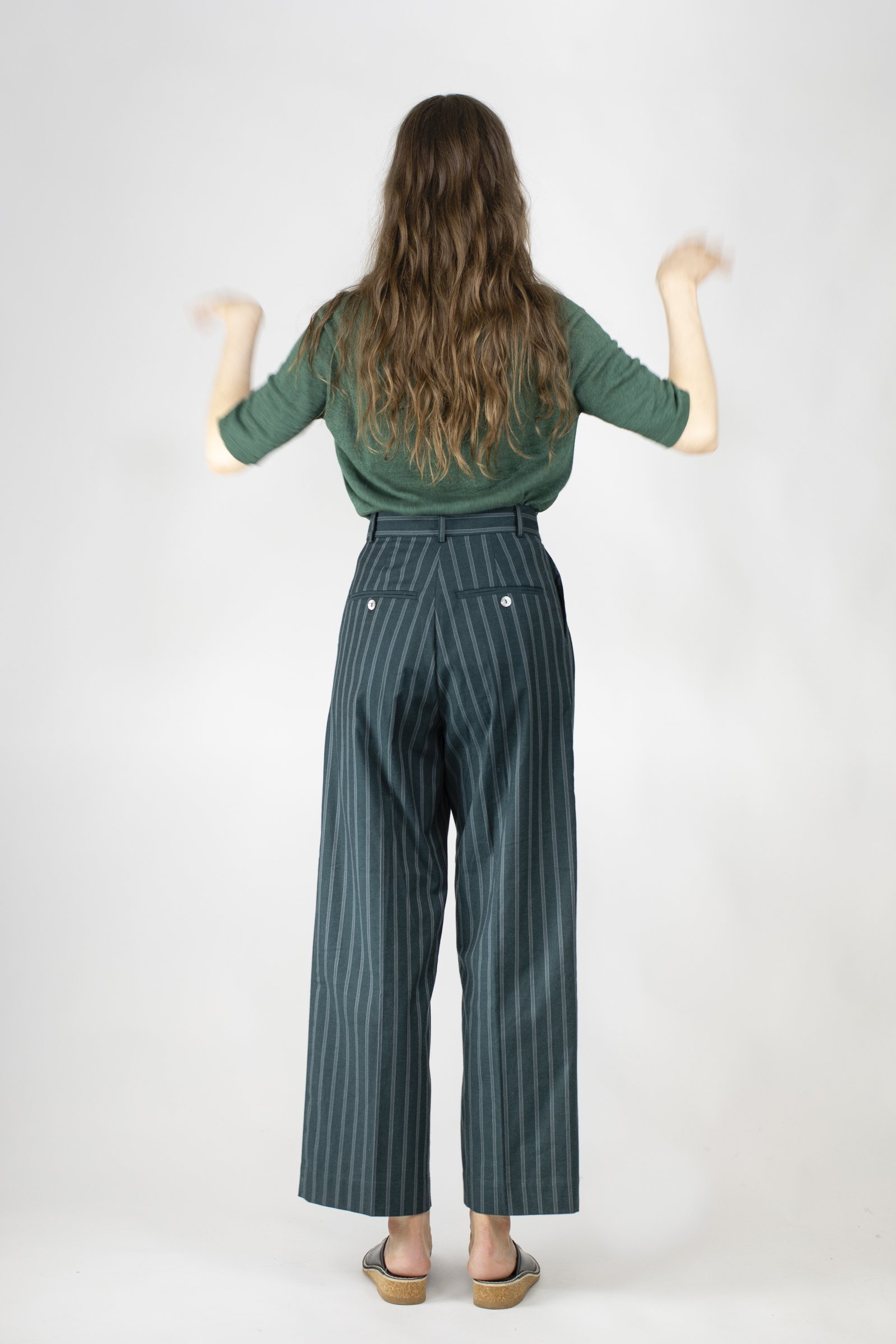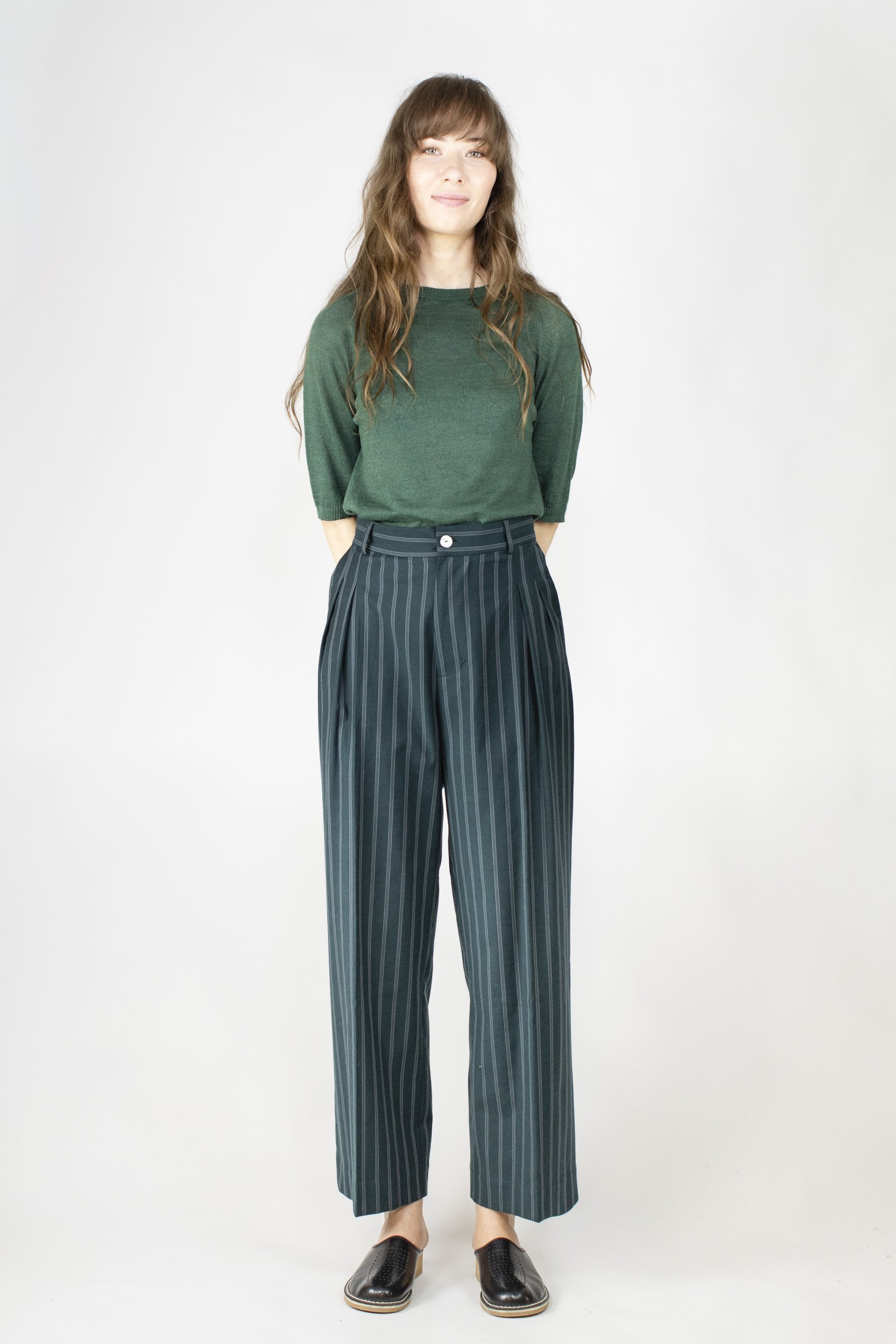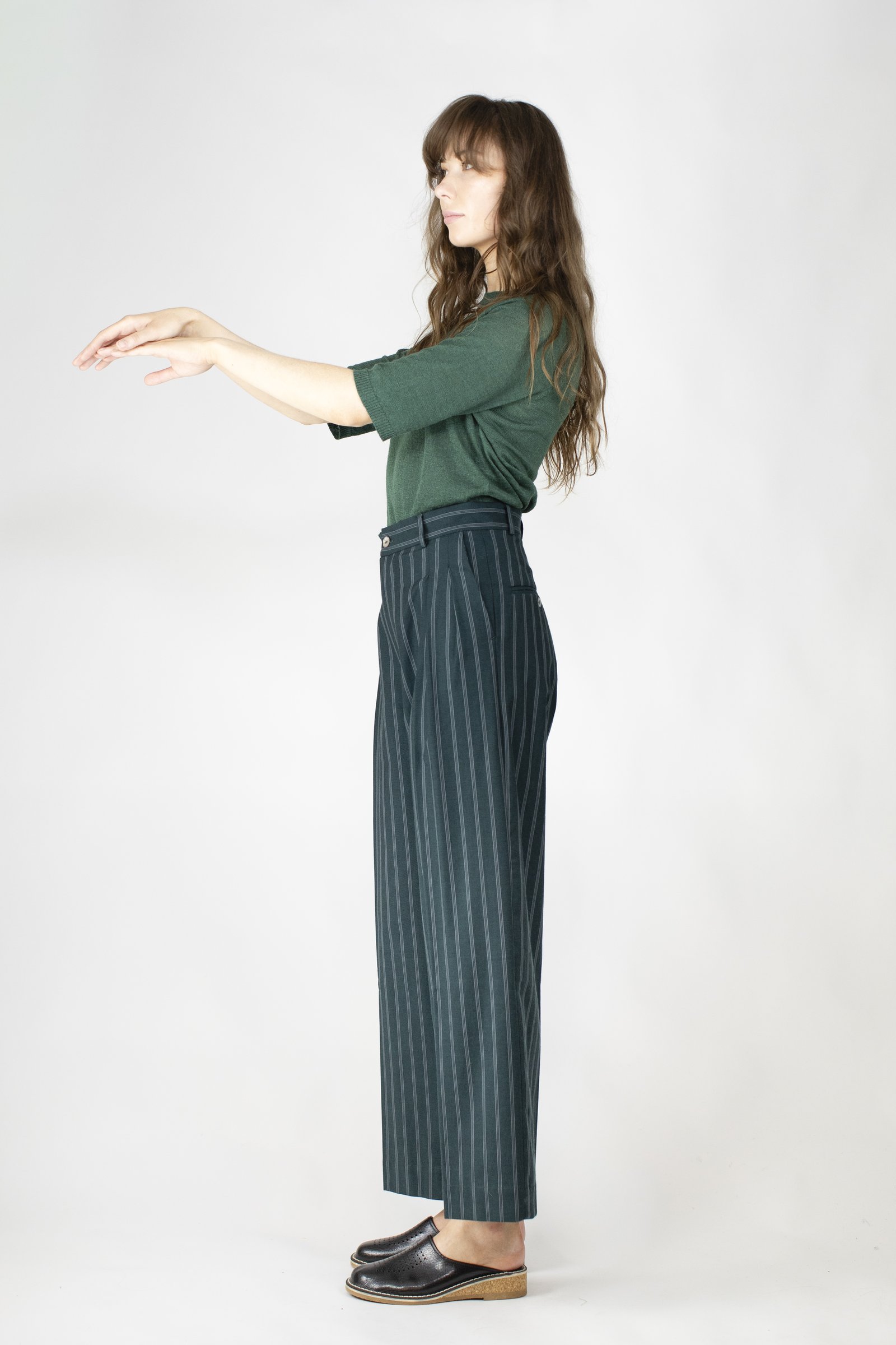 Wide trousers with front pleats. Slanted side pockets.