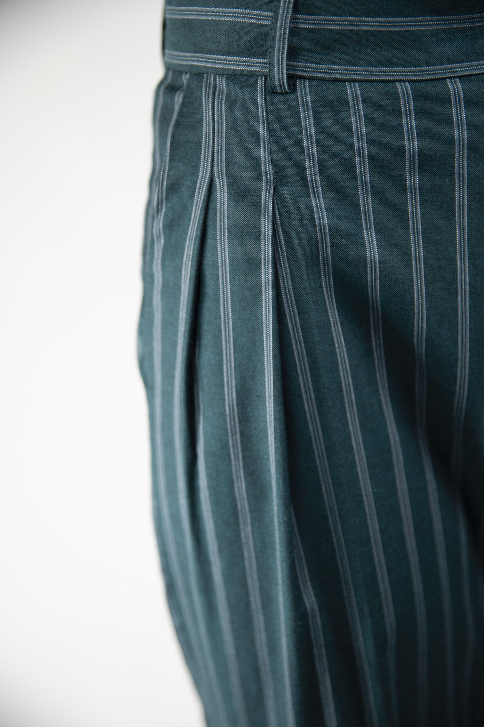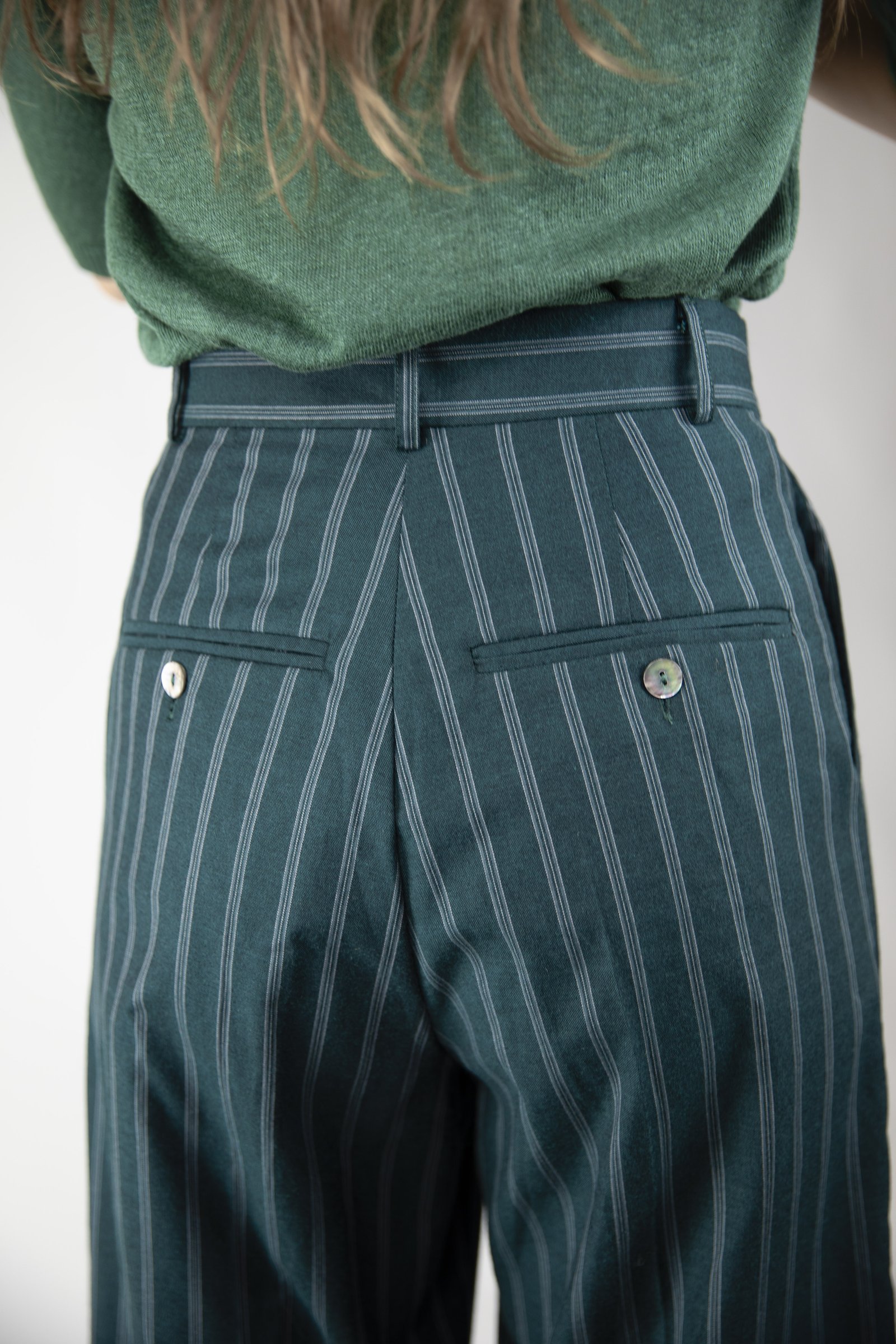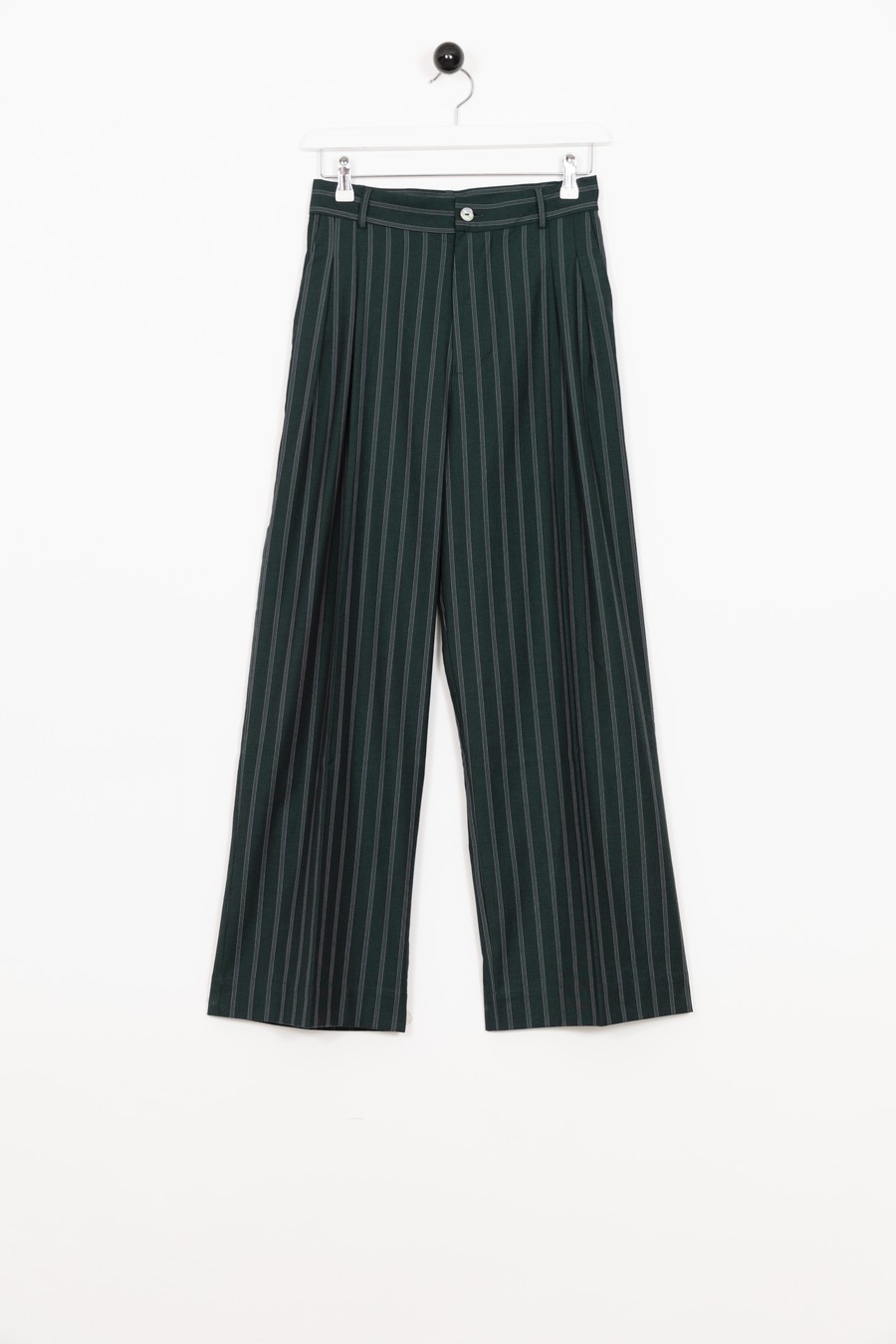 Wide trousers with front pleats. Slanted side pockets.