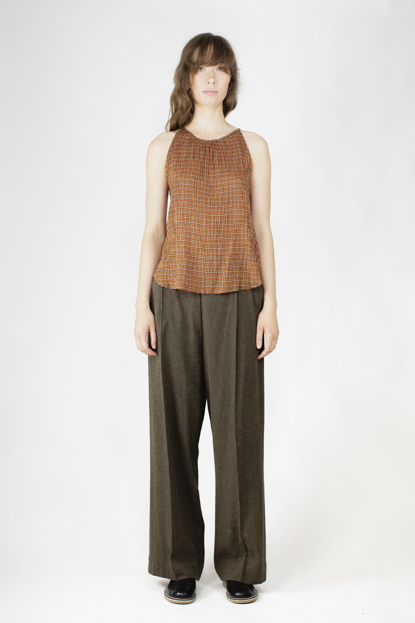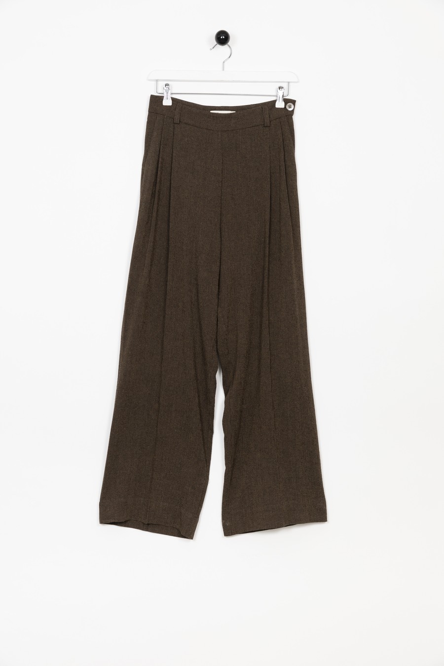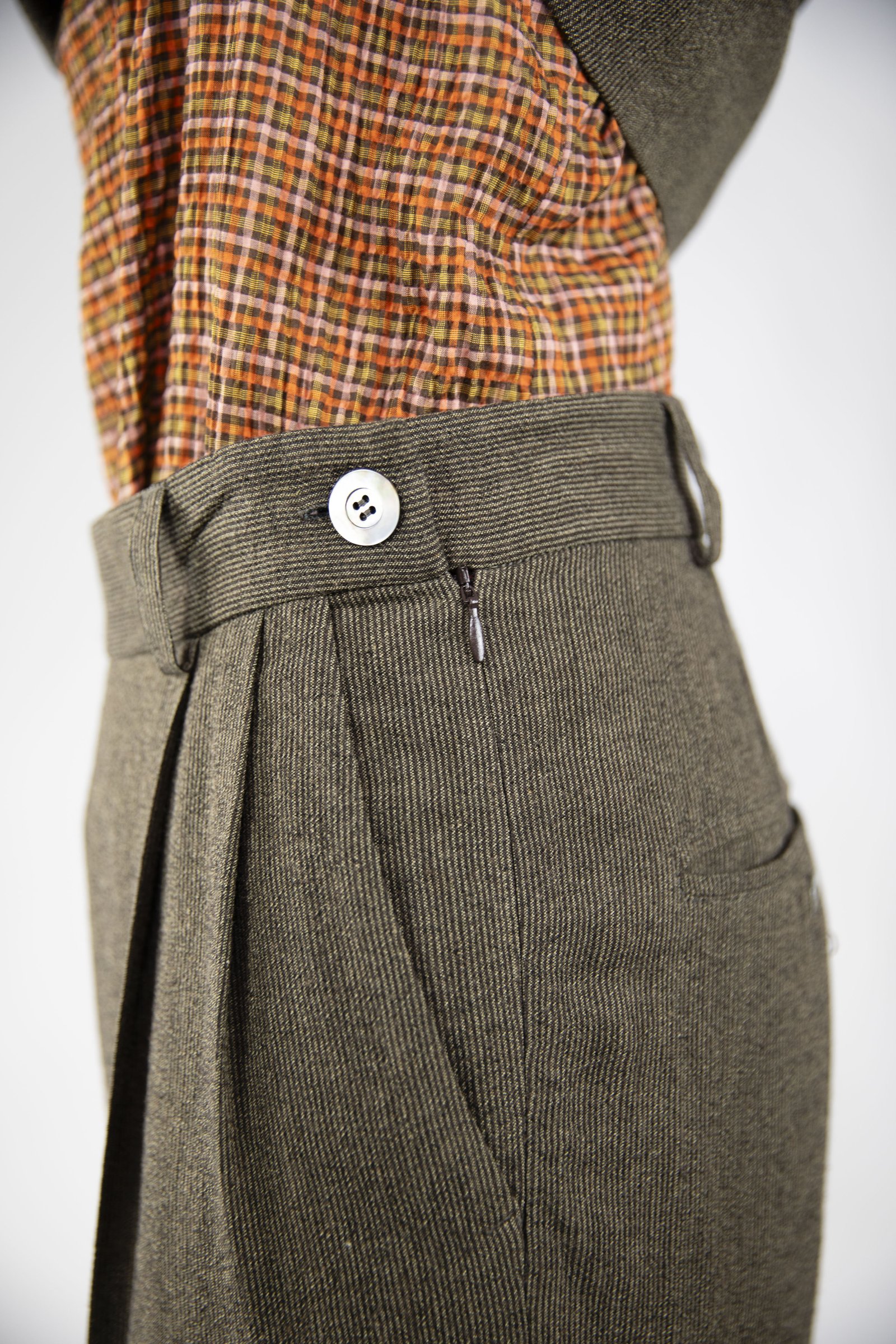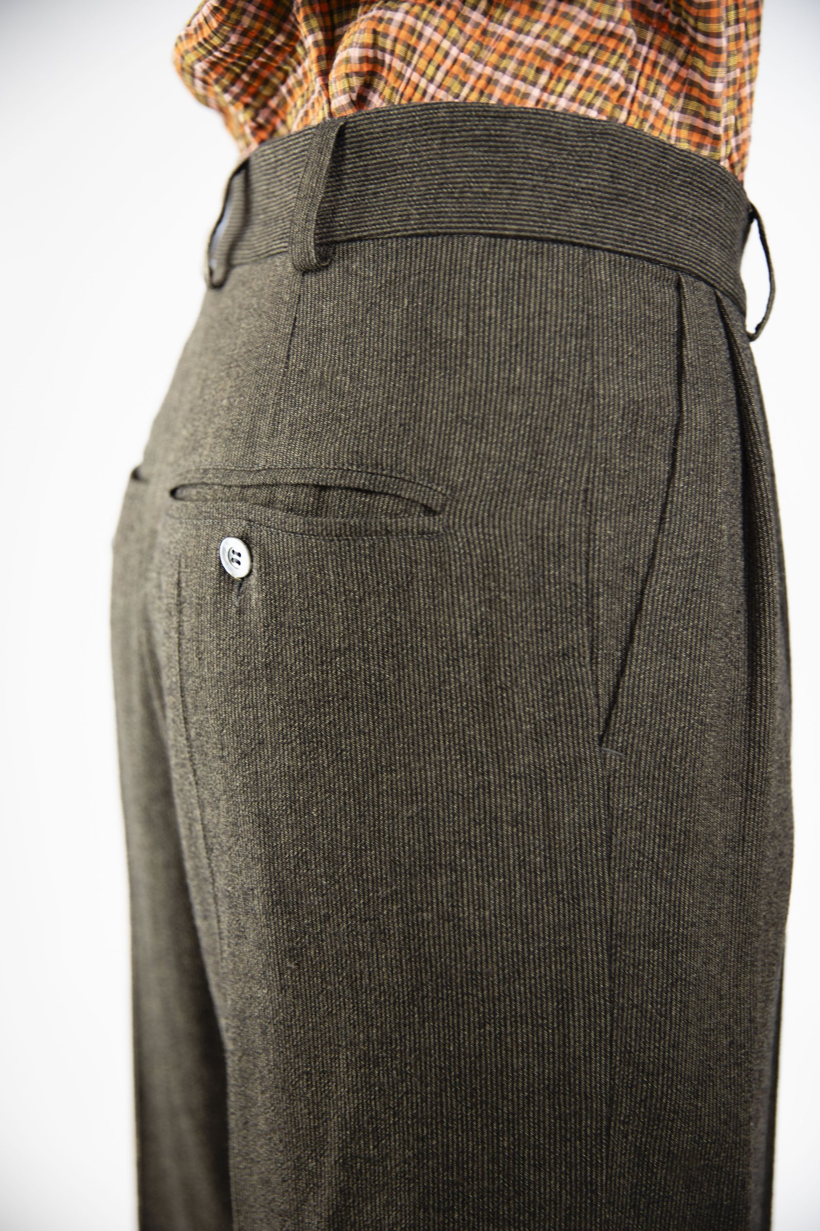 Wide trousers with front pleats. Slanted side pockets. Welt pockets in back. Zipper in side seam.